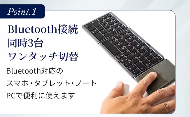 また、このキーボードは最大3台のデバイスに同時接続できる点も魅力です。Bluetooth接続により、初期設定も簡単で、ワンタッチで接続先を切り替えられます。スマートフォン、タブレット、ノートパソコンを同時に使う場合でも、再ペアリングの手間がかかりません。さらに、折りたたみ式のデザインにより、バッグの中でもかさばらず、出張やカフェでの作業、移動中の使用にも適しています。