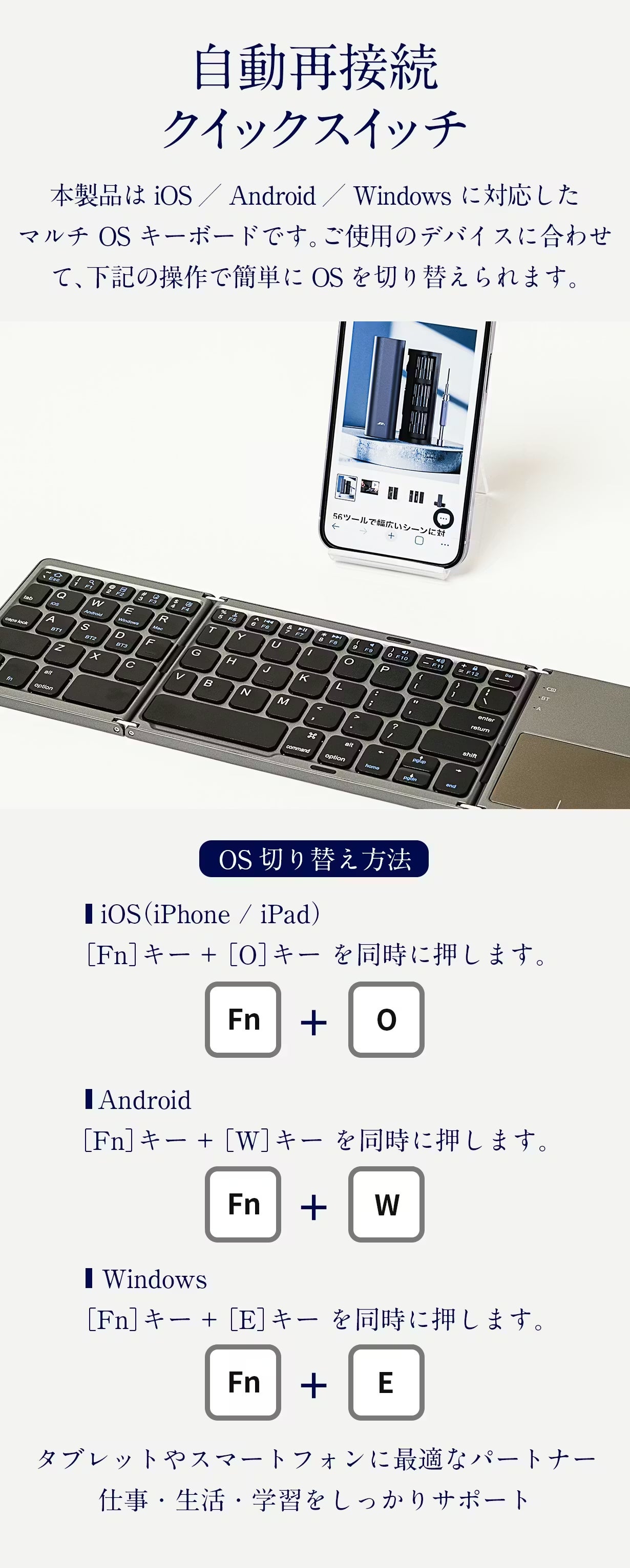 折りたたみキーボードの大きな特長の一つが、複数のOSに対応し、簡単に切り替えられる点です。iOS、Android、Windowsの3つのシステムをキー操作だけで瞬時に変更できるため、複数のデバイスを併用する人にとって非常に便利です。クイックスイッチ機能を使えば、キー操作だけですぐに切り替えができます。