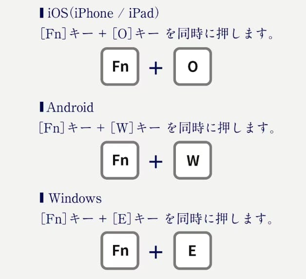 iOS、Android、WindowsのマルチOSに対応しており、簡単なキー操作でスムーズに切り替えが可能です。iPhoneやiPadの場合はFn+O、AndroidはFn+W、WindowsはFn+Eを同時に押すだけで切り替えが完了します。複数のデバイスを併用するAppleユーザーでも、1台のキーボードで快適に作業を続けることができます。