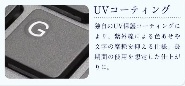 まず、独自のUVコーティングによって、紫外線による色あせや文字の摩耗を抑制しています。これにより、長期間使い続けても折りたたみキーボードのキーの文字が消えにくく、美しい状態を保ちやすいのが特徴です。日常のさまざまな環境でも変わらない品質を提供し、安心して長く愛用できる仕上がりとなっています。キートップの見た目だけでなく、触り心地も滑らかで、快適な操作感を実現しています。