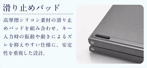 さらに、折りたたみキーボードの底面には高摩擦シリコン素材の滑り止めパッドを採用。入力時の振動や動きによるズレをしっかり抑え、どんな場所でも安定したタイピング環境を実現します。移動中やデスクが不安定な場所でも安心して使える設計で、快適な作業を支えます。安定感が増すことで、長時間の使用でも疲れにくく、効率的に作業が進められます。
