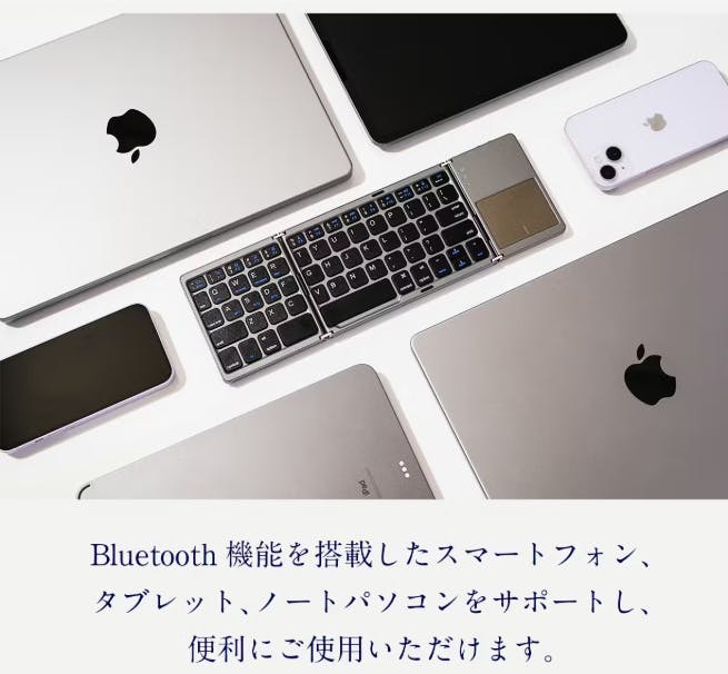 これらの仕様から分かるように、本製品は単なる携帯用キーボードではなく、外出先でも妥協しない入力環境を実現するために設計されています。サイズ、構造、接続性のすべてが実用レベルでまとまっており、日常業務から移動中の作業まで幅広く対応できる一台です。コンパクトさと信頼性を両立した折りたたみキーボードとして、多様なシーンで活躍します。