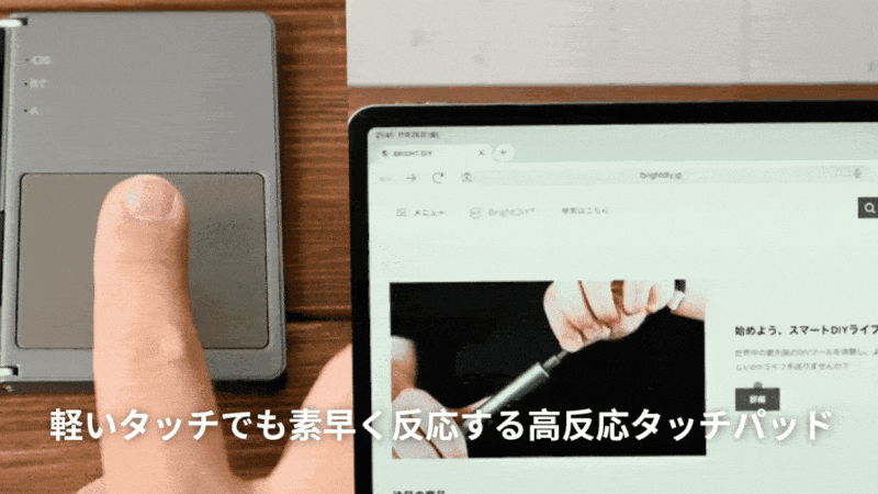 展開時のサイズは横幅約30.2cm、高さ約9.7cmで、モバイル向けながらフルキーボードに近い配列を実現しています。64キー構成に加え、Xシザー構造を採用することで、薄型設計でありながら安定した打鍵感を確保しています。折りたたみ時の厚さは約1.8cmと非常にスリムで、バッグの中でもかさばりにくく、携帯性と操作性を高いレベルで両立しています。