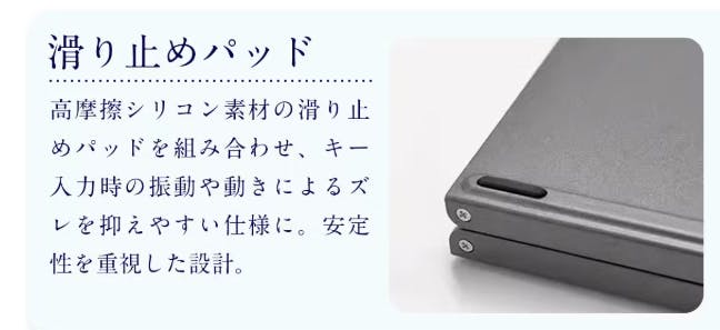 まず、滑り止めパッドはキー入力時の振動や動きによる本体のズレを効果的に抑えます。高摩擦のシリコン素材を使用することで、使用中の不意なスライドを防止し、安定したタイピング環境を提供します。これにより、ゲームプレイや長時間の作業でも集中を途切れさせず、快適に使い続けられます。滑り止め効果が高いため、テーブルが滑りやすい環境でも安心して使用可能です。