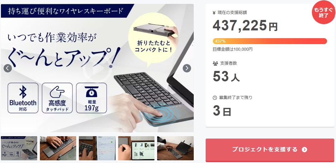 プロジェクト終了後、「197gの超軽量!折りたたみ式ワイヤレスキーボードで快適作業を」をCampfire特別価格で入手することはできなくなりますので、ご支援がまだの方、追加支援をご検討の方はお急ぎくださいますようお願い申し上げます。