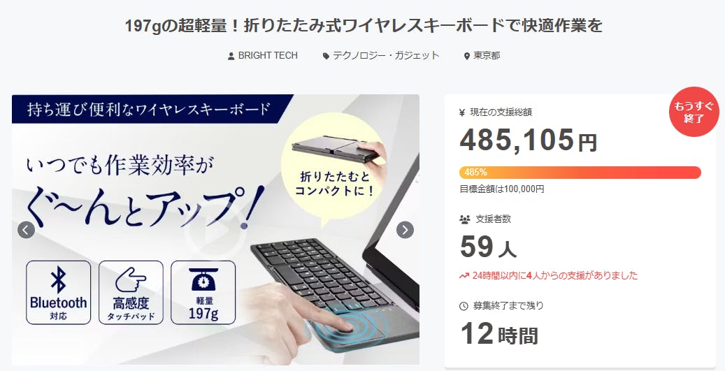 2026/01/31 12:00ご支援者様、197gの超軽量!折りたたみ式ワイヤレスキーボードで快適作業をにご興味をお持ちいただきありがとうございます。お陰様で、開始から支援総額48万円達成することができました!終了までわずか12時間となります。<197gの超軽量ボディと折りたたみ式デザインで、持ち運びに便利なワイヤレスキーボードが登場!Bluetooth接続で複数デバイスを簡単に切り替え、静音設計で快適なタイピングを実現します。外出先やカフェでも、快適に作業したい方にぴったりの一台です。ぜひご体験ください!>プロジェクト終了後、「197gの超軽量!折りたたみ式ワイヤレスキーボードで快適作業を」をCampfire特別価格で入手することはできなくなりますので、ご支援がまだの方、追加支援をご検討の方はお急ぎくださいますようお願い申し上げます。ご興味のある方、ぜひ支援お願い致します。https://camp-fire.jp/projects/906242/viewBrightチームは、当プロジェクトをもっと多くの方に知っていただきたいと考えております。よかったら、FacebookやTwitter等のSNSでのシェア・拡散をお願い致します。#折りたたみキーボード #brightdiyどうぞよろしくお願い致します。Brightチーム もっと見る