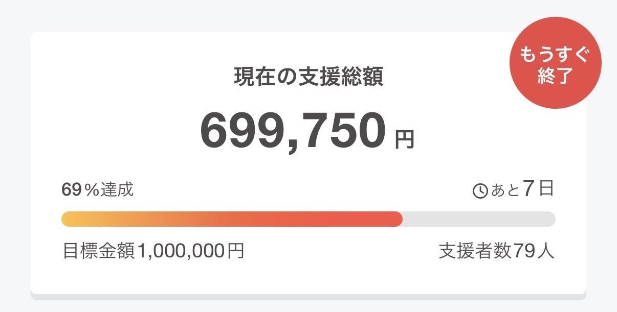 ここまでで79人の方々からご支援いただき支援額が69万9750円となりました涙