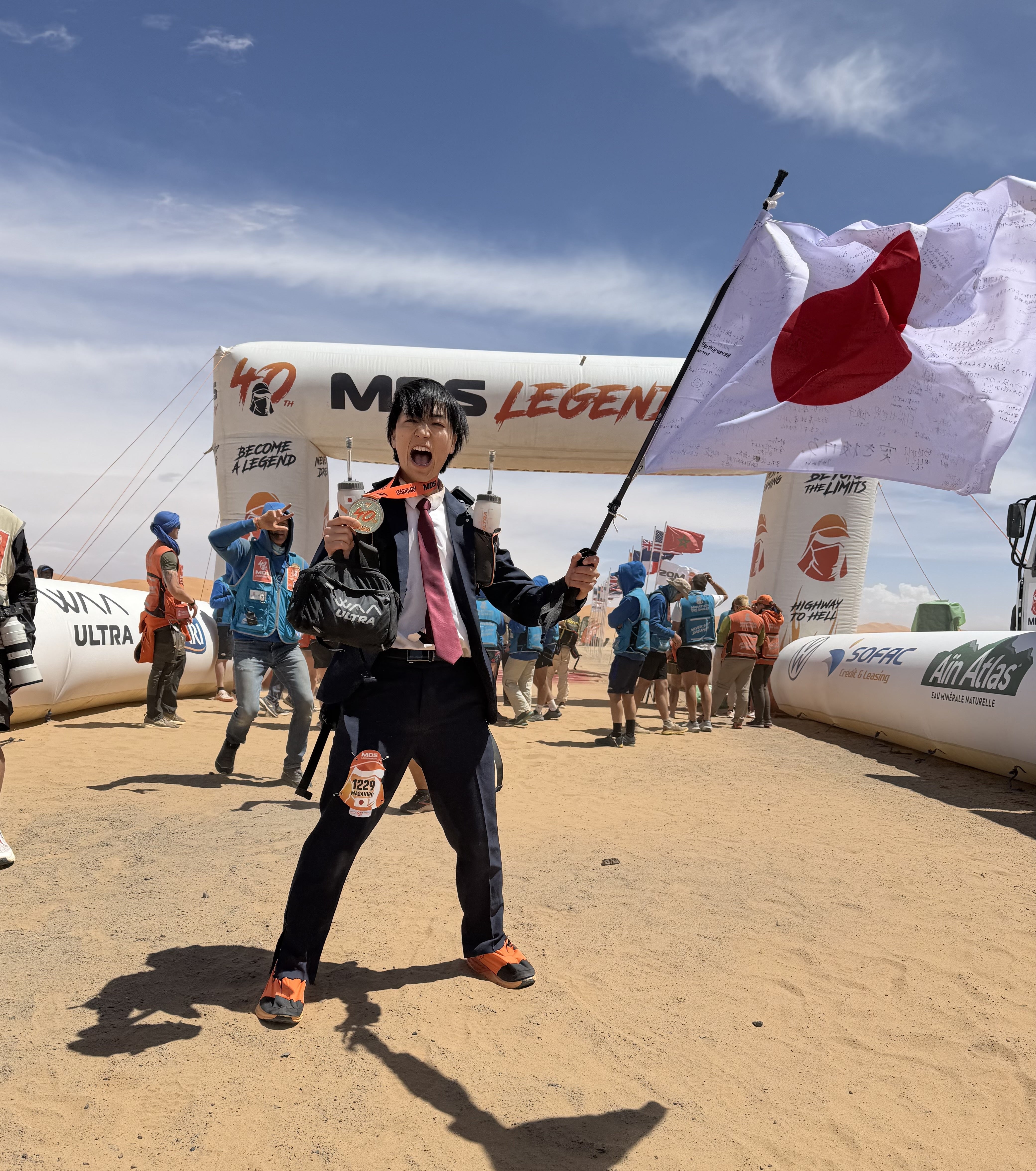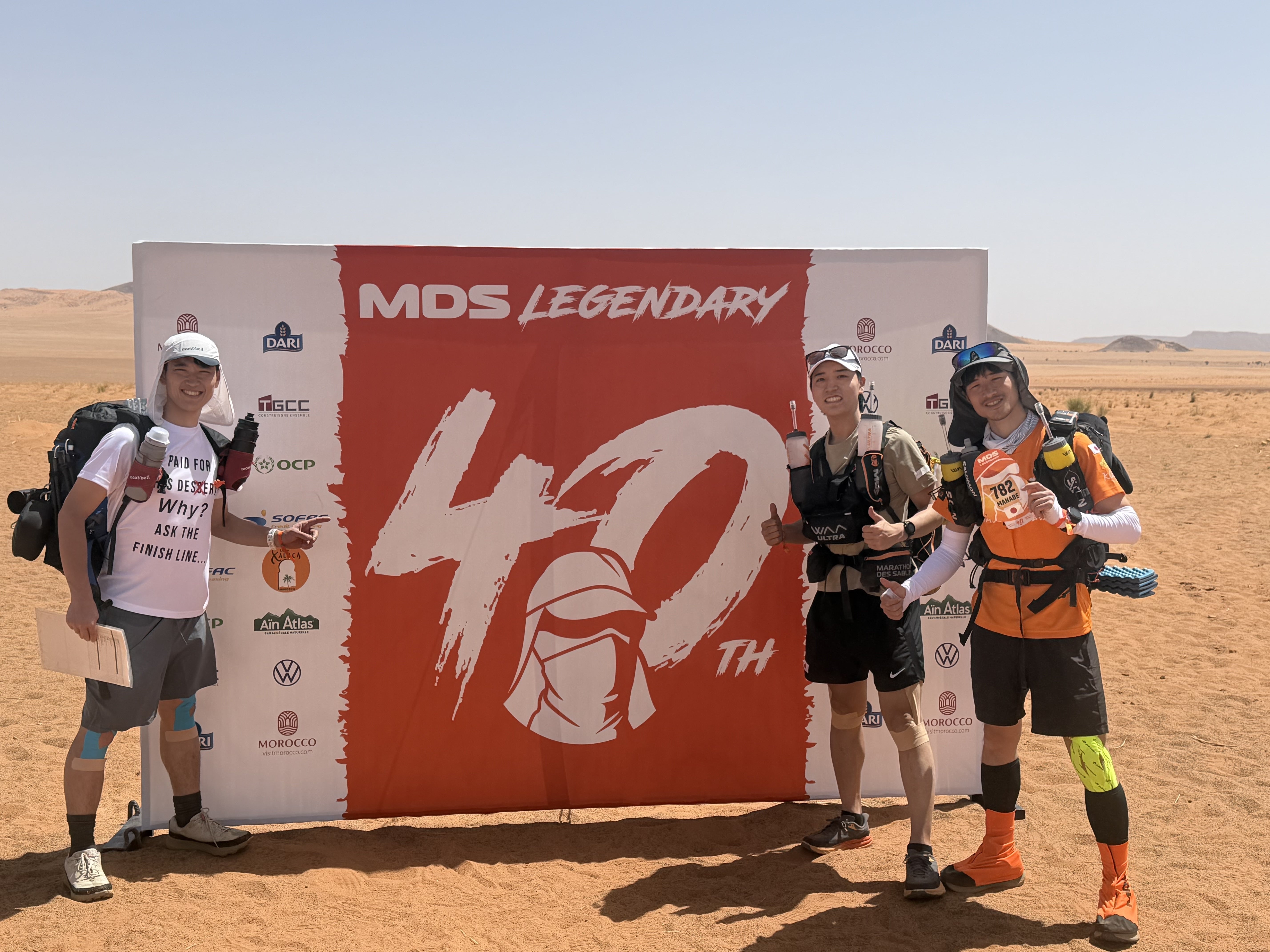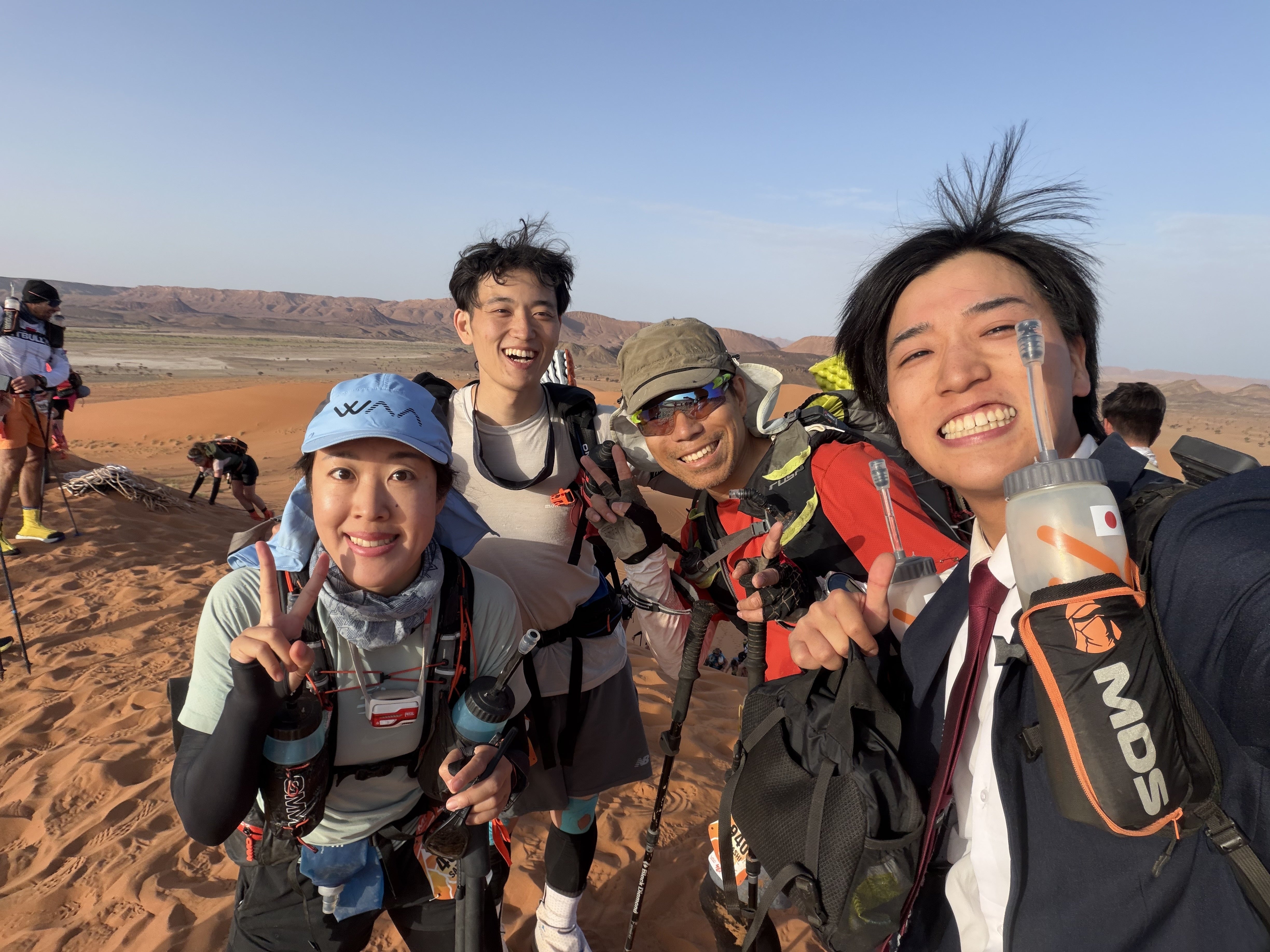 レース中、海外の人からは「お前はなんてクレイジーなんだ!?」「砂漠でのアポイントメントは何時からだ?」「日本人は砂漠でも仕事をしないといけないほどの企業奴隷なのか?」「手にはランチボックスを持ってるのか?」などというジョークをたくさん言われました笑