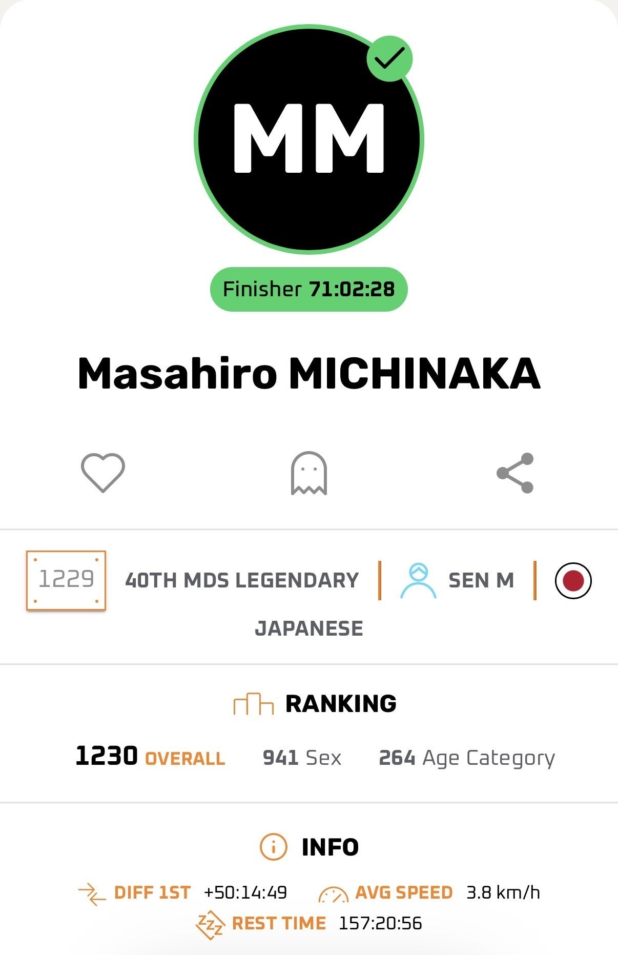最終結果:71時間2分28秒 最終順位:1230位 という結果でした。