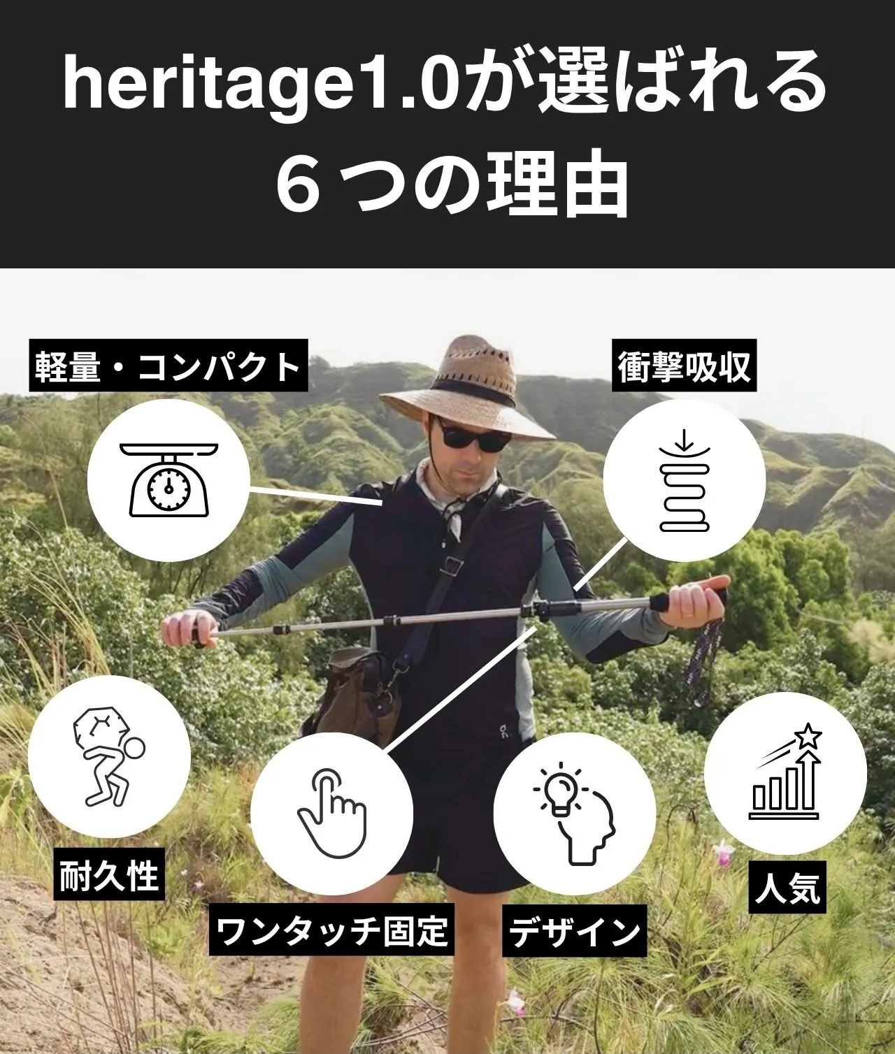 heritage 1.0 は、「初めての1本として絶対に失敗しないトレッキングポール」として開発されました。
