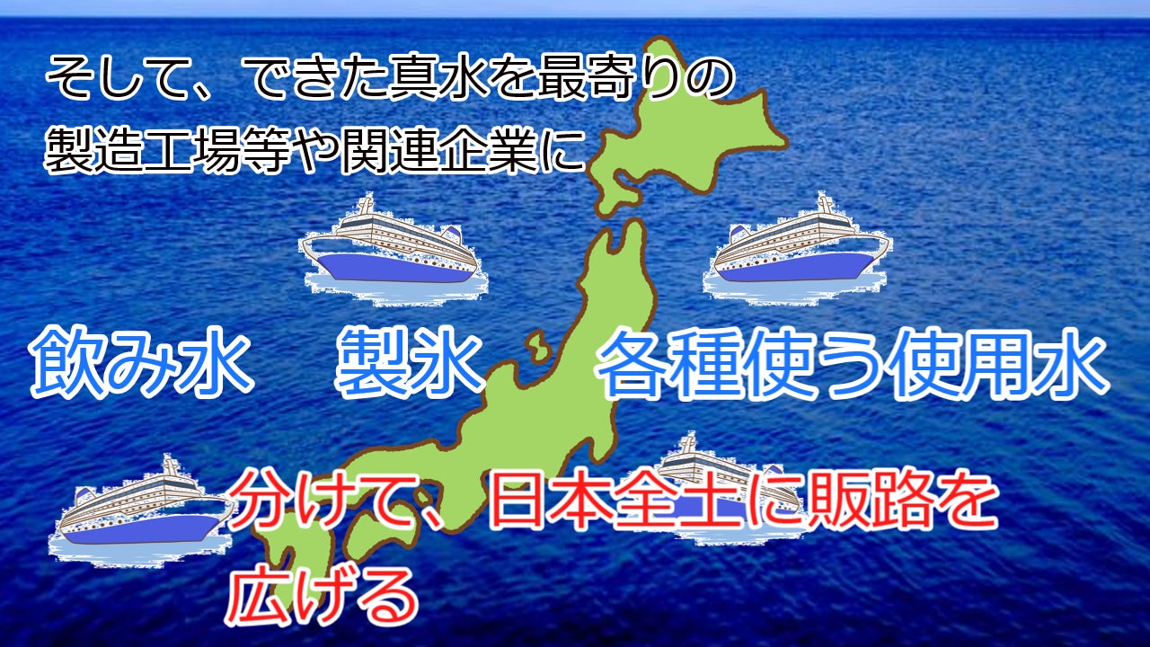 私が構想している事業は、海水から真水を作ることから始まります。生活水、農業用水、工業用水、等そして氷の製造まで。海洋で又陸で働く皆さんに水や氷を供給することで、水不足の解消を図りたいのです。