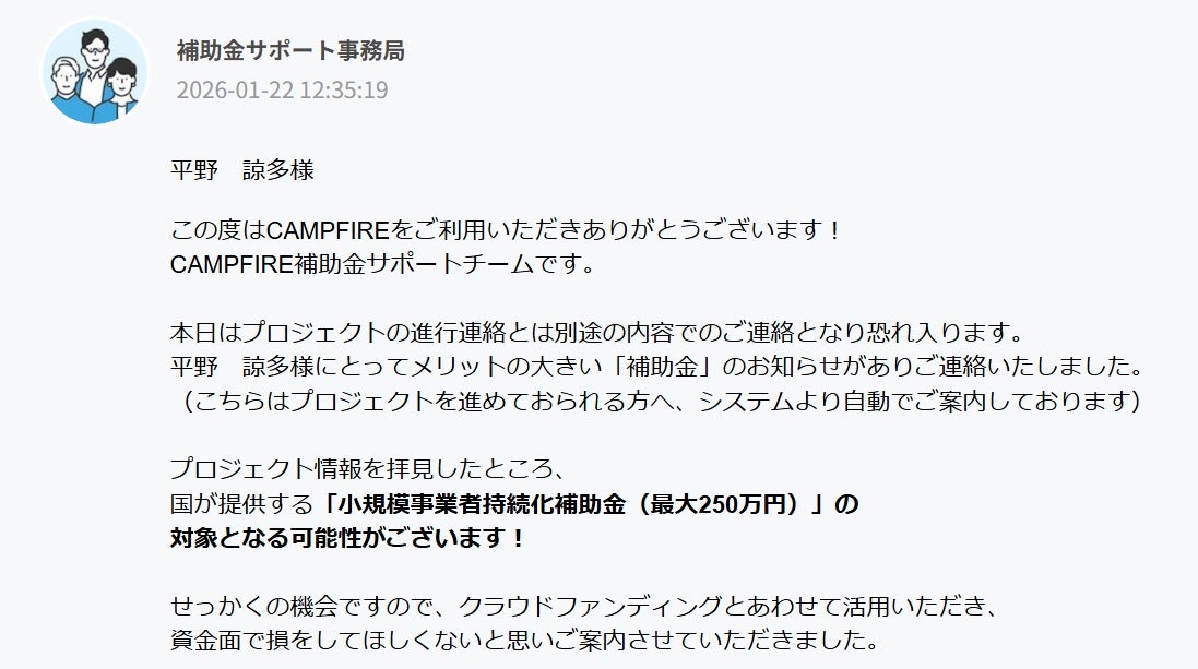 2026/01/22 20:08内容といたしましては、この度はCAMPFIREをご利用いただきありがとうございます!CAMPFIRE補助金サポートチームです。本日はプロジェクトの進行連絡とは別途の内容でのご連絡となり恐れ入ります。平野 諒多様にとってメリットの大きい「補助金」のお知らせがありご連絡いたしました。(こちらはプロジェクトを進めておられる方へ、システムより自動でご案内しております)プロジェクト情報を拝見したところ、国が提供する「小規模事業者持続化補助金(最大250万円)」の対象となる可能性がございます!せっかくの機会ですので、クラウドファンディングとあわせて活用いただき、資金面で損をしてほしくないと思いご案内させていただきました。という通達が来ています。私といたしましては、こちらも一度申し込んでみて必要書類を用意していきたいと思っておりますですが、クラウドファンディングも並行してやっていく所存です今後も引き続きご支援とこんな考え方をする人がいるんだという認知と暖かい応援をよろしくお願いします もっと見る