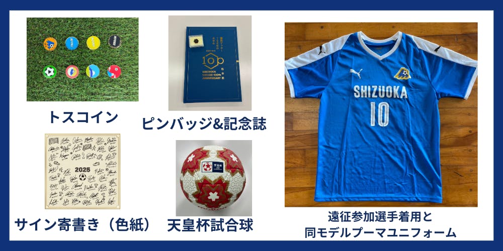 今回のクラウドファンディングでは、静岡FAオリジナルグッズや選手サイン入りグッズのリターン、体験型のリターンなど15種類以上のリターンを用意しました。 クラウドファンディング限定のリターンも複数ありますので、ぜひこの機会に支援してください。