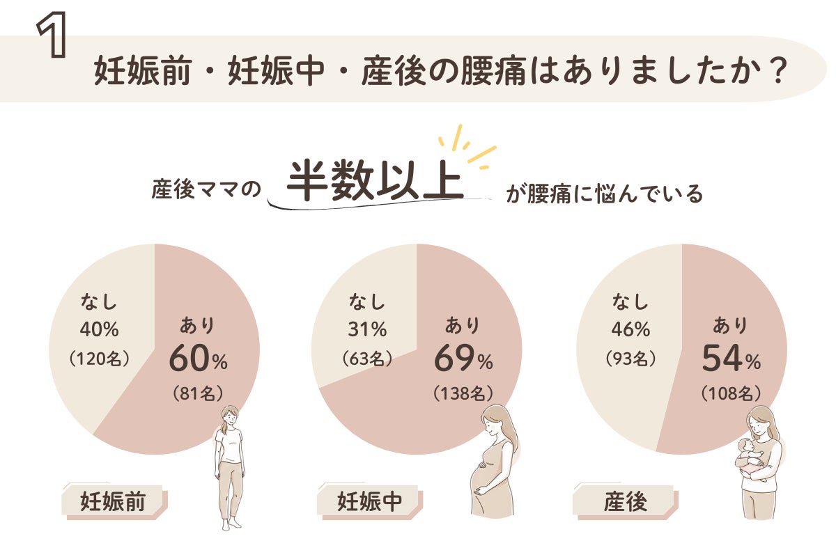調べてみると、産後ママの約5割が腰痛、約3割が尿漏れに悩んでいることがわかりました。