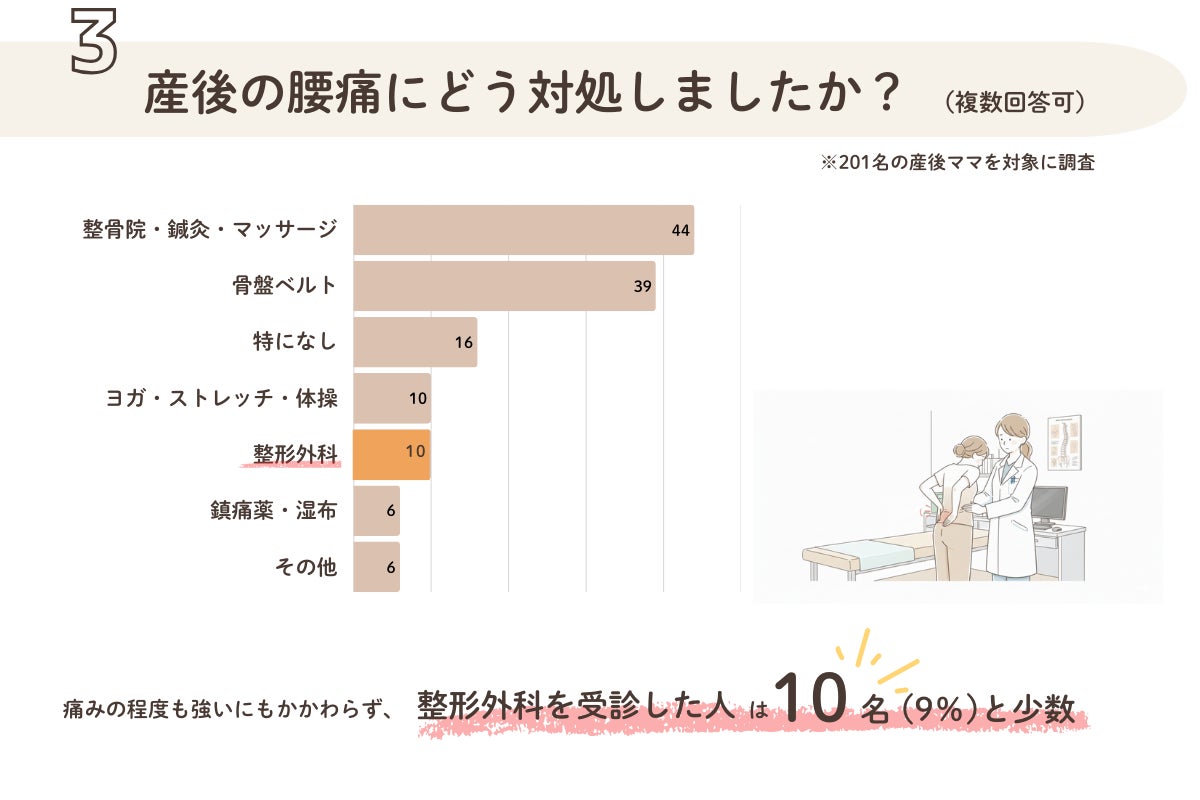 その疑問の答えをもとめて、201名の産後ママを対象に、産後腰痛についての調査を行いました。