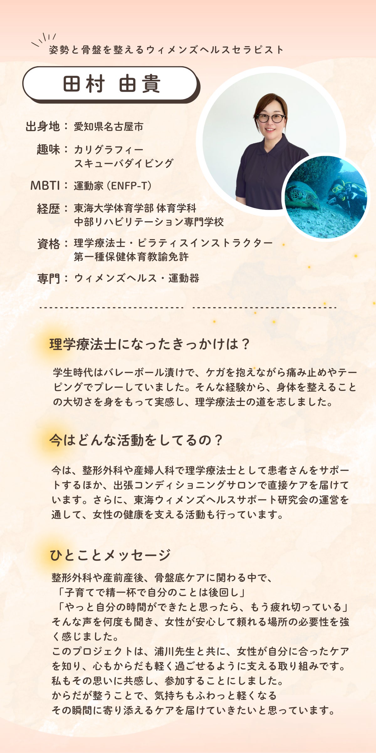 私は、産前産後の腰痛や骨盤底の問題からくる尿漏れの研究や治療を行っており、メンバーの皆さんともウィメンズヘルス分野で一緒に関わらせていただいております。
