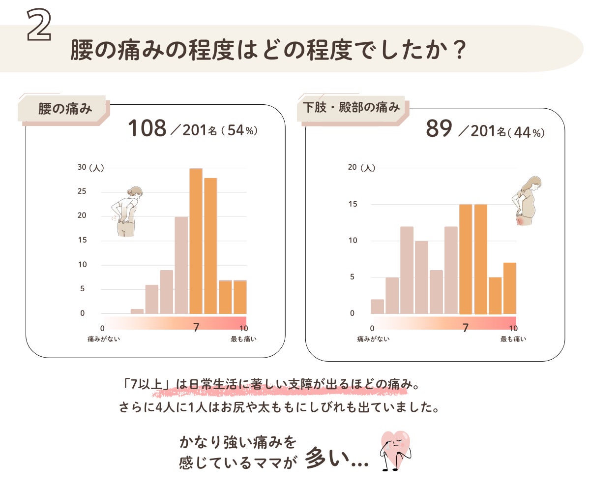 腰痛の痛みの程度は、最も痛い痛みを10とした時に「7レベル」が最も多く、かなり強い痛みを感じているママが多いことが分かりました。