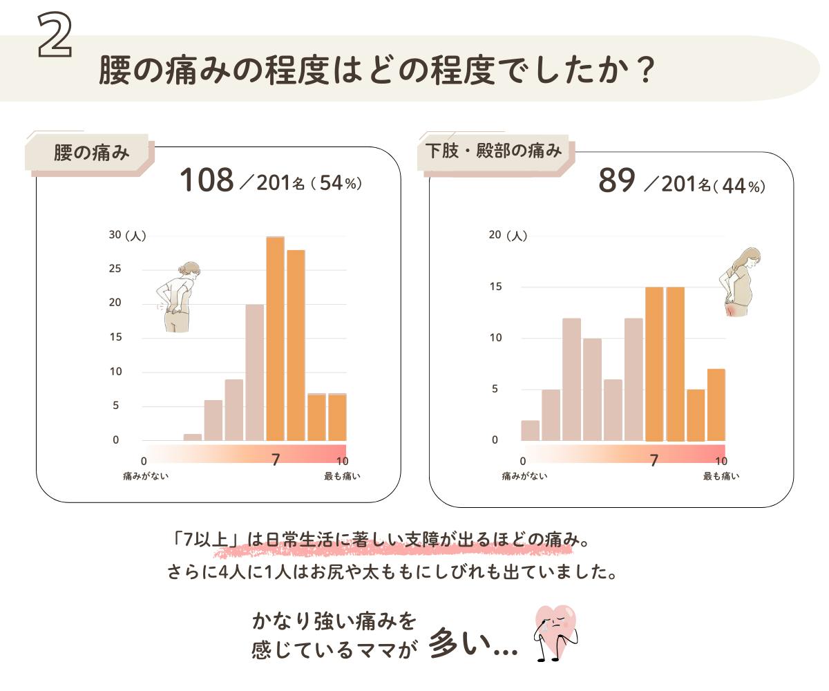腰痛の痛みの程度は、最も痛い痛みを10とした時に「7レベル」が最も多く、かなり強い痛みを感じているママが多いことが分かりました。