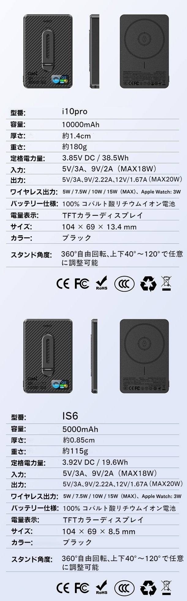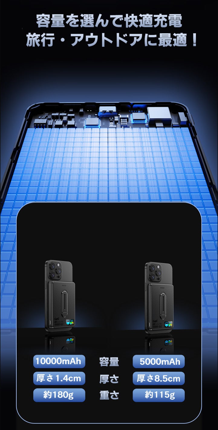 5000mAhモデルはわずか8.5mm・115gのスリムボディで持ち運びやすく、日常使いに最適です。10000mAhモデルは14mm・180gの手のひらサイズで、充電状況もひと目で確認でき、使うたびに楽しくなるデザインです。