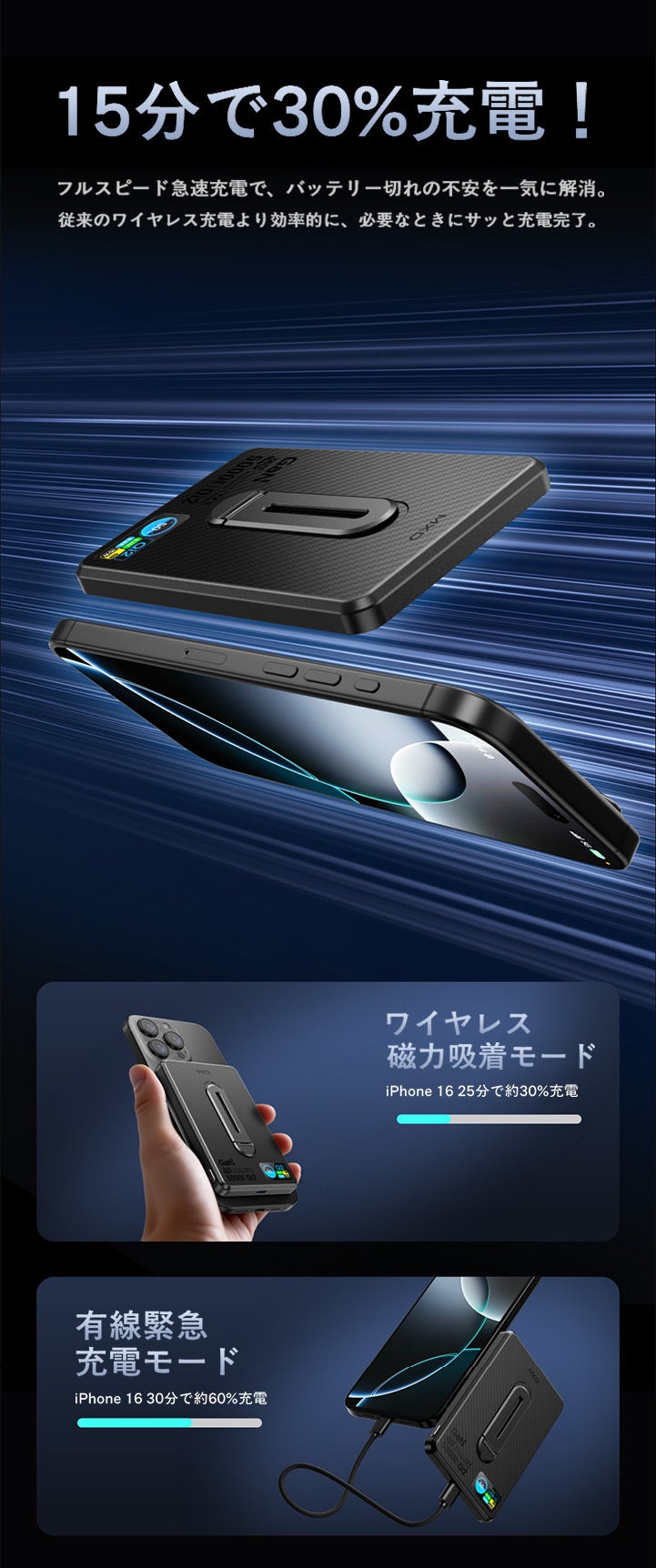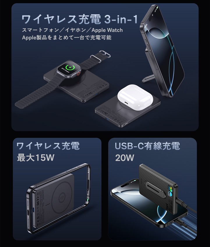 マグネット式・ワイヤレス・有線の3つの充電モードに対応。ワイヤレス最大15W、有線最大20Wの高速充電で、外出先でもスマホを効率的にパワーアップできます。