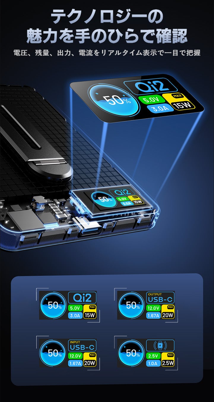LEDインジケーターではなく、TFTカラースクリーンを採用。電量・電圧・電流をリアルタイムで表示し、動作状況を一目で把握できます。