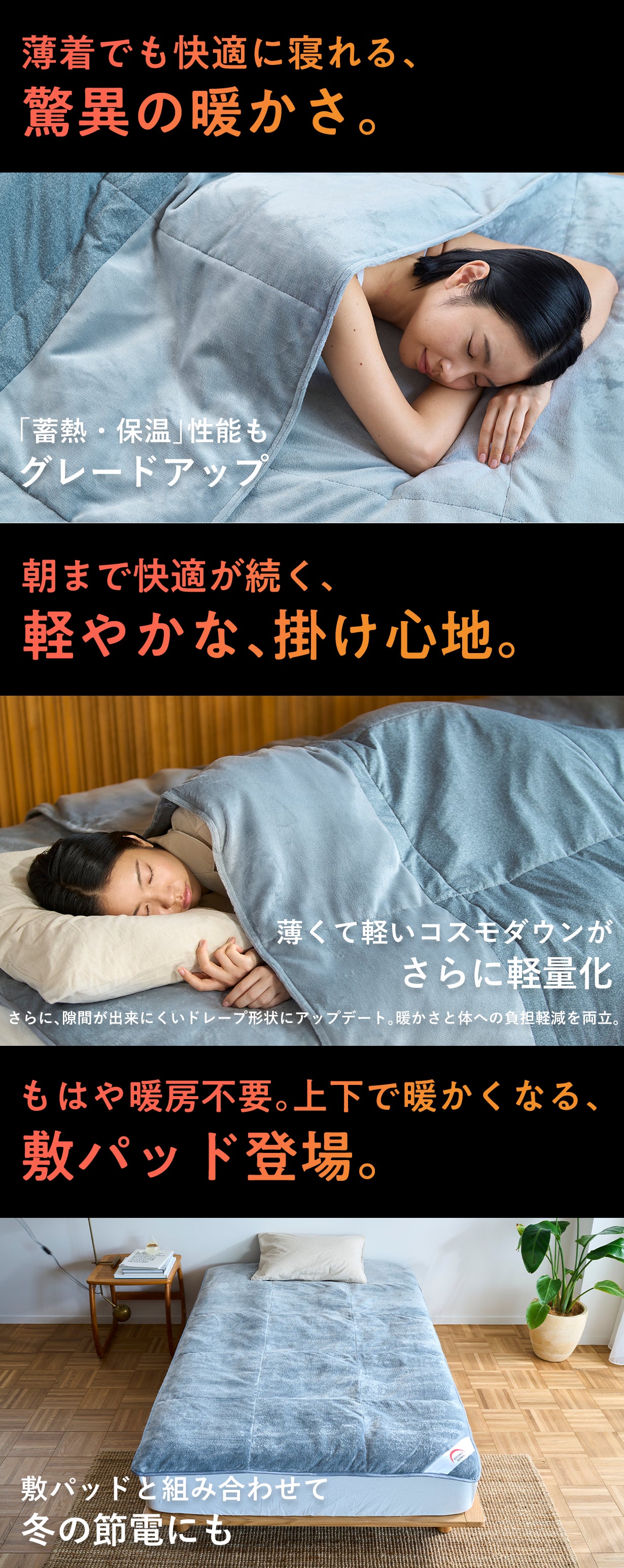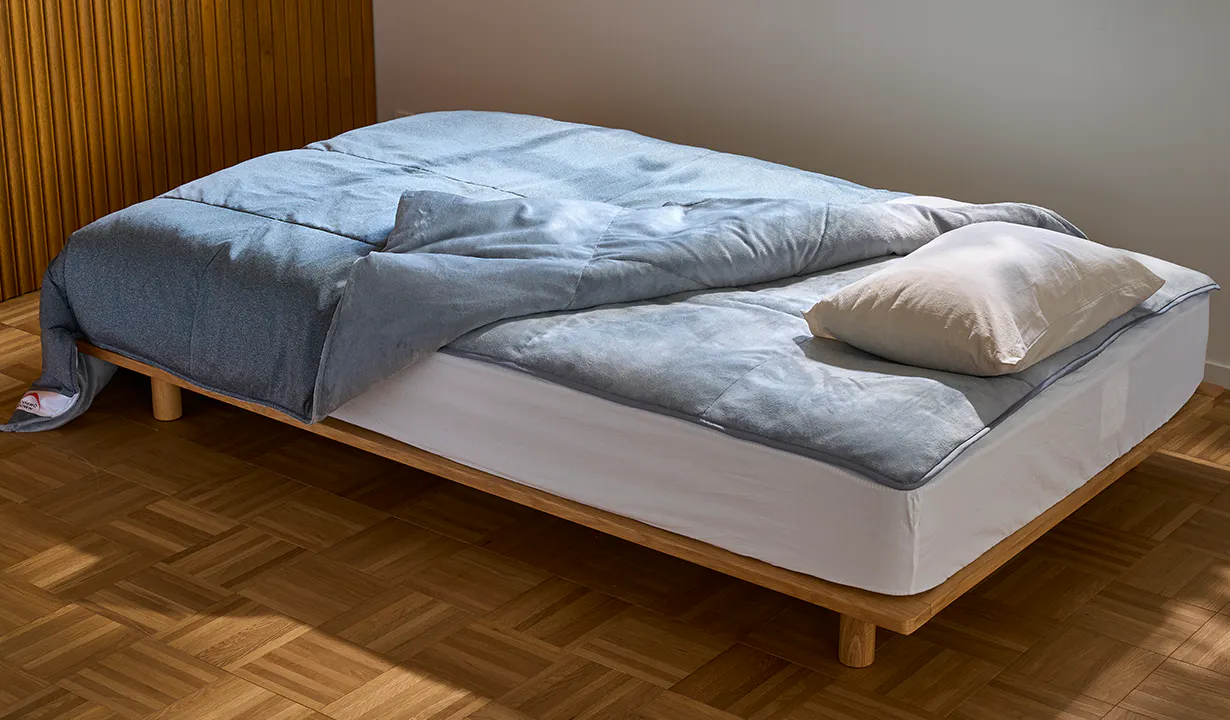 掛け布団と同様にエアロゲルを使用した敷きパッドで底冷えをシャットアウト。4隅ゴム付きで敷き布団、マットレスにもご使用いただくことができます。
