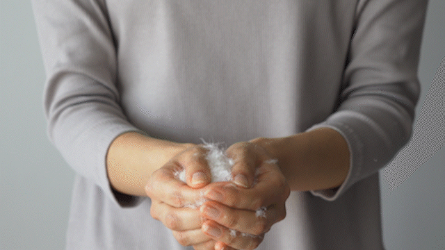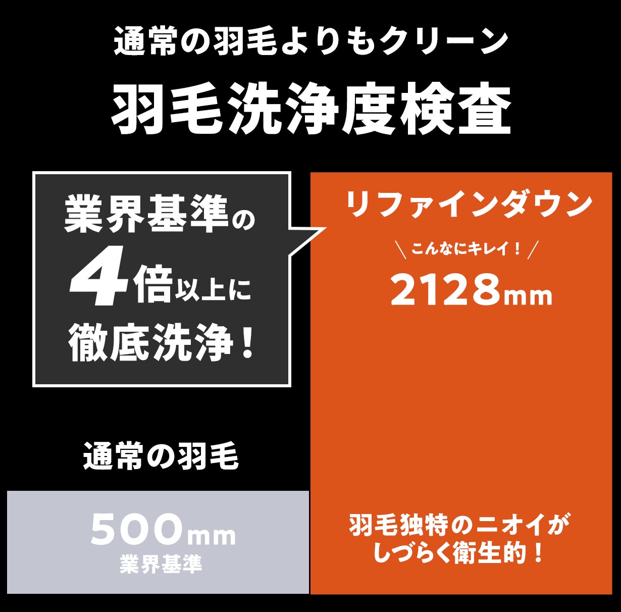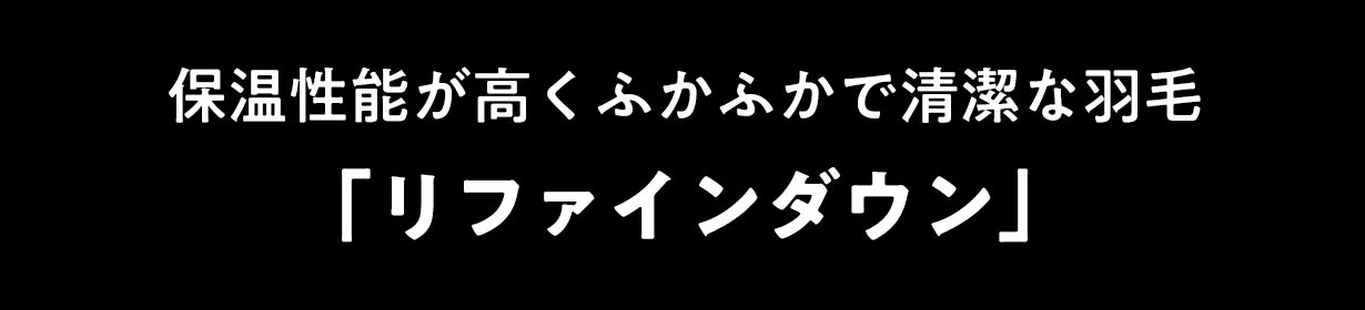 通常の羽毛の4倍以上に徹底的に洗浄された「リファインダウン」はとっても衛生的。120℃の蒸気と熱風を羽毛に吹き掛ける『パワーアップ加工』を施し、微細なゴミの臭いも排除されダウンボールが綺麗に開き、採れたてのようなふかふかな羽毛で温度を保ちます。