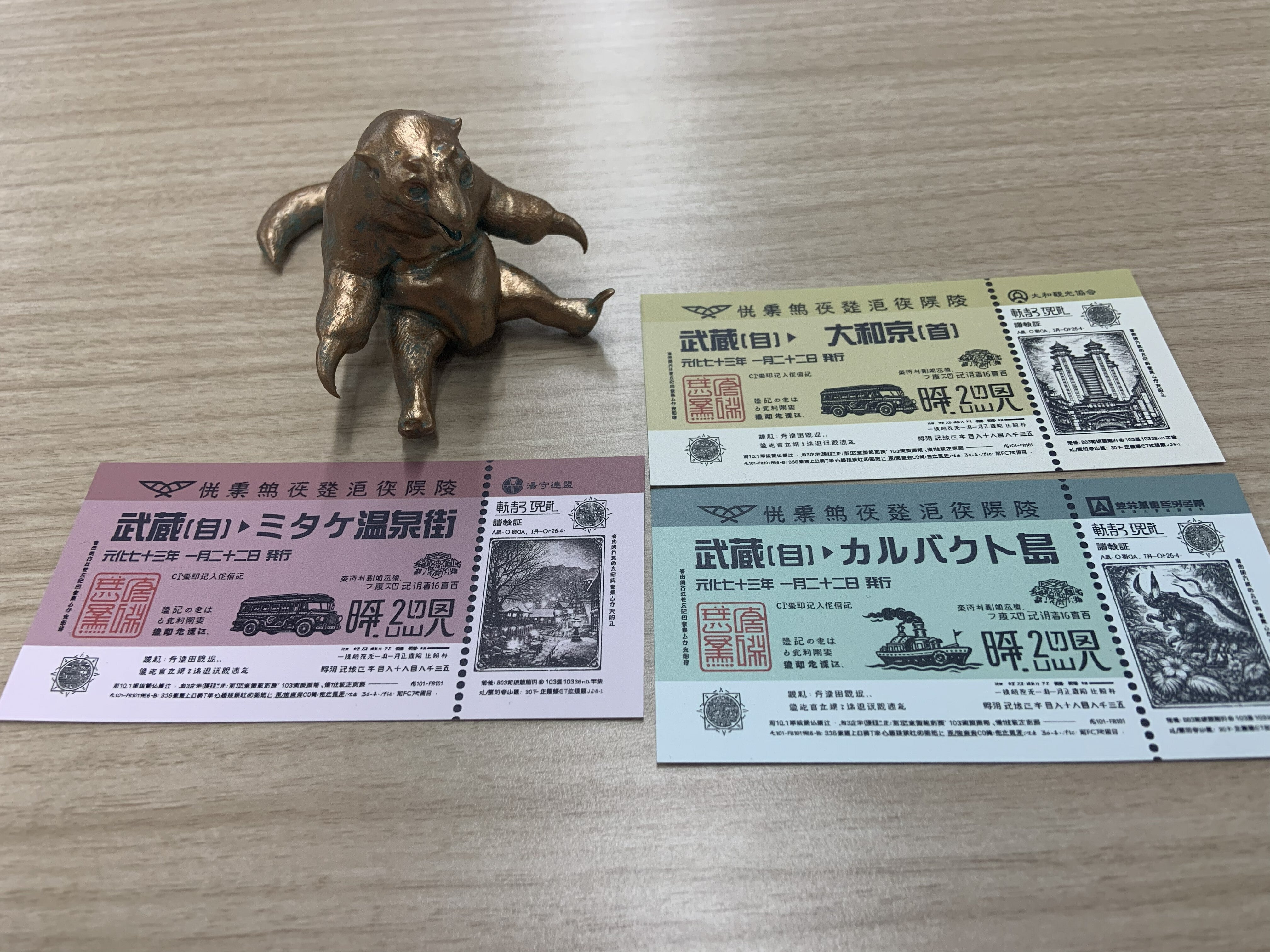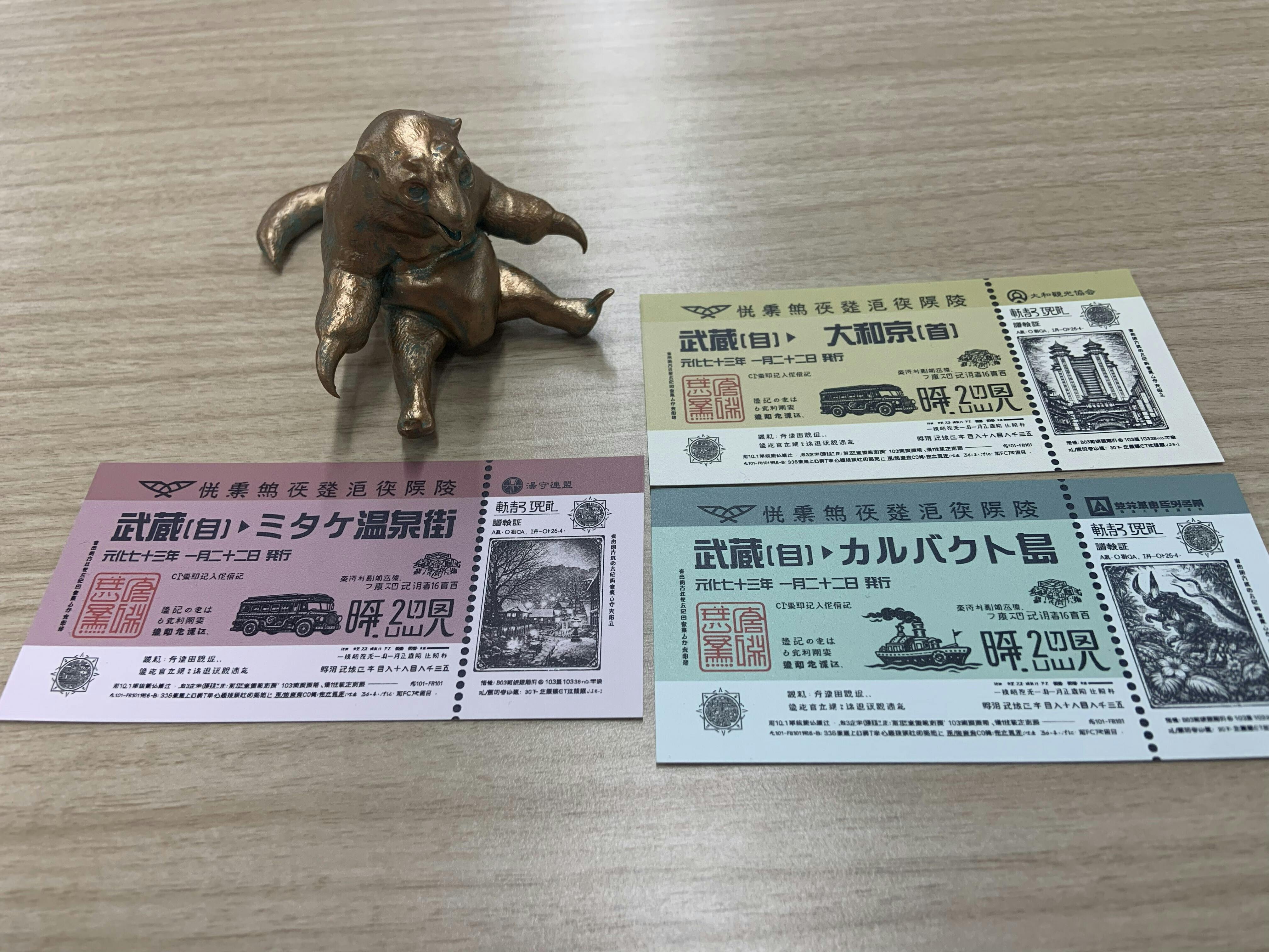 本日は、第一弾追加リターン品の中から「八島旅行チケット」「オウギヤの天走券」「電脳殿ポストカード」のサンプルが到着いたしましたので、皆様にご紹介いたします。