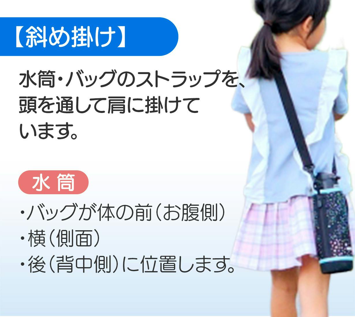まず、斜め掛けと縦掛けによって水筒・バッグの位置がどのようになるか説明します。