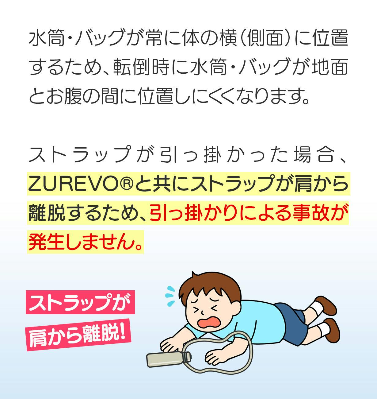 すなわち、ZUREVO®を使い、水筒・バッグを「縦掛け」にすることで子どもたちの安全を確保することができます。