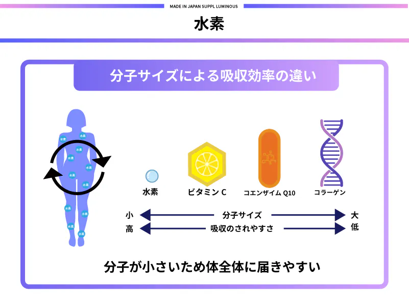 水素分子は、コラーゲンやビタミンCの約1/1000万という極小サイズ。