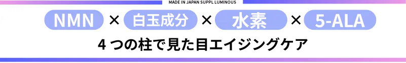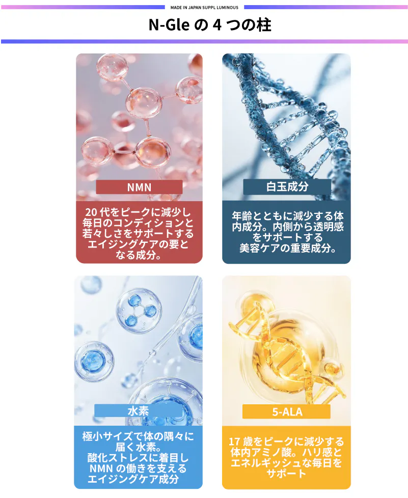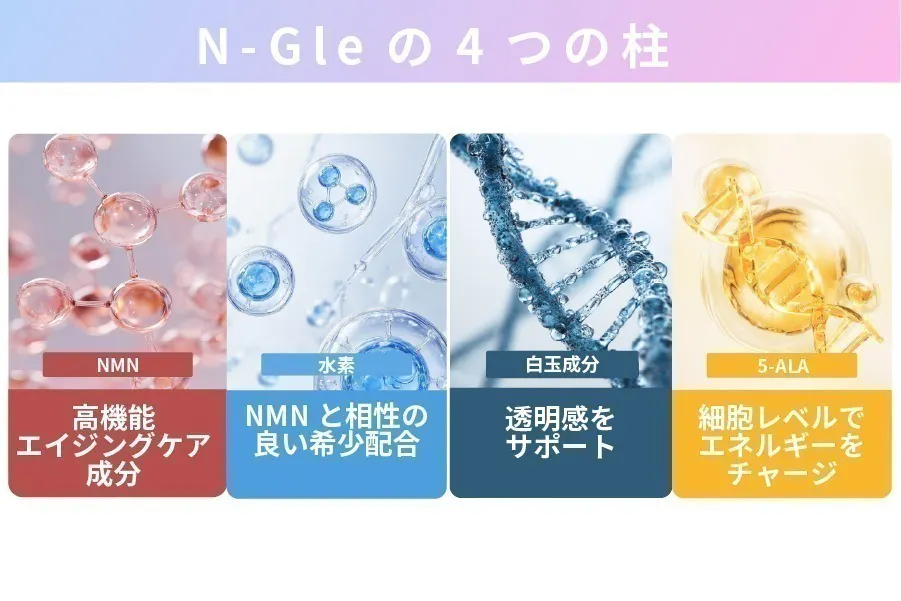 NMN・水素・グルタチオン・5-ALAが、内側からの若々しさを多方面からサポートします。
