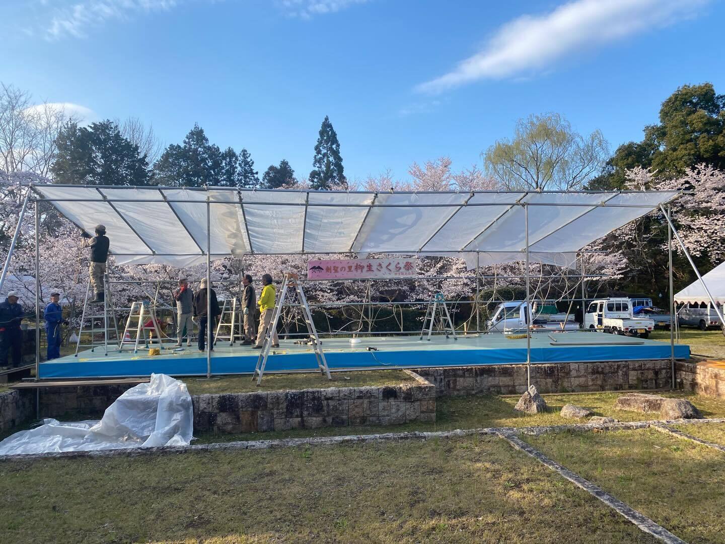 旧柳生藩陣屋跡の桜は満開本日、柳生さくら祭のテント設営と舞台準備を行いました。町内外のボランティアの皆様。奈良市東部出張所&地域おこし協力隊の皆様にご協力いただき無事完成しました。8年ぶりに雨対策として天井をつけました。天候は神様に祈るのみですが、受け入れ準備は万端。当日是非、おこしください!