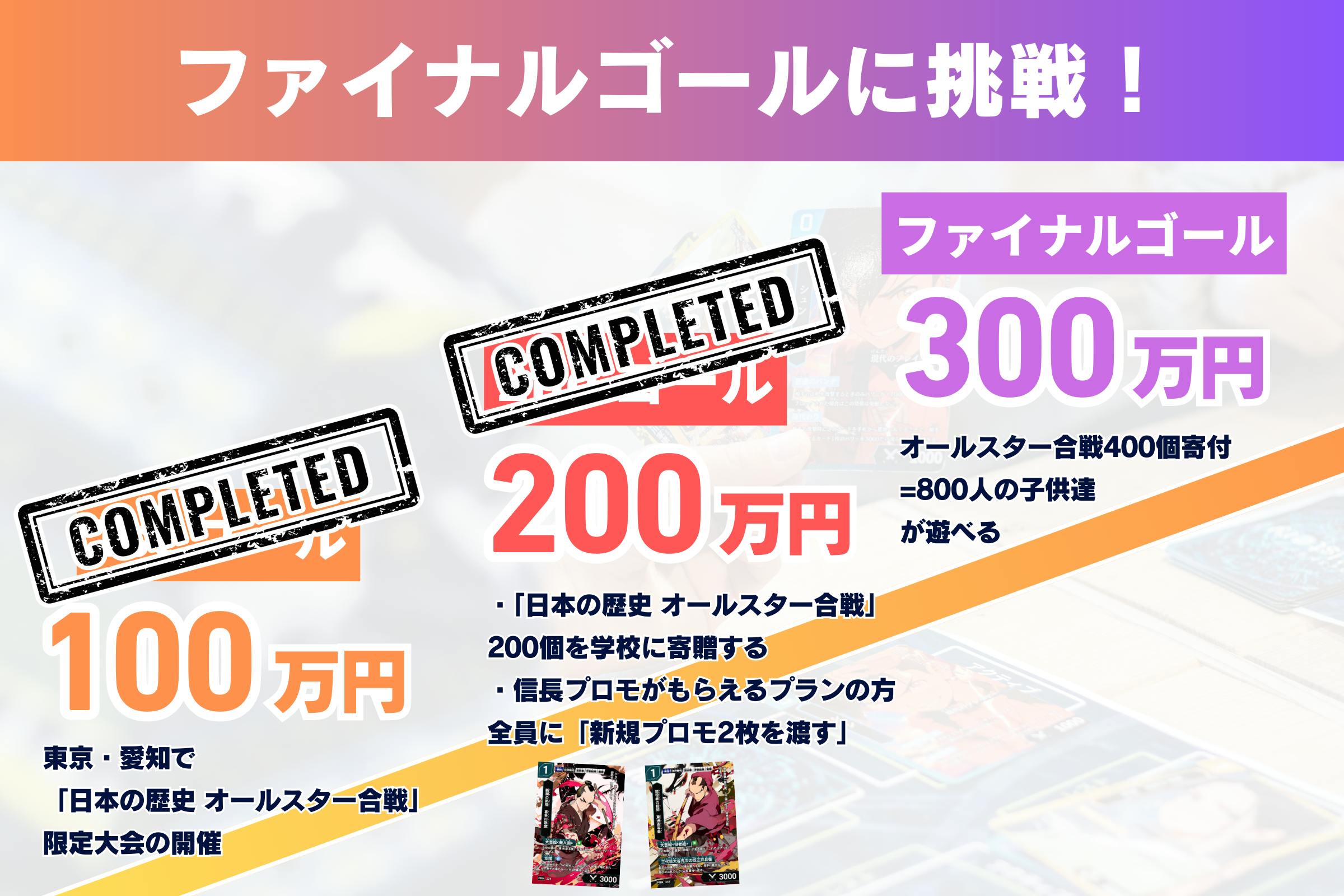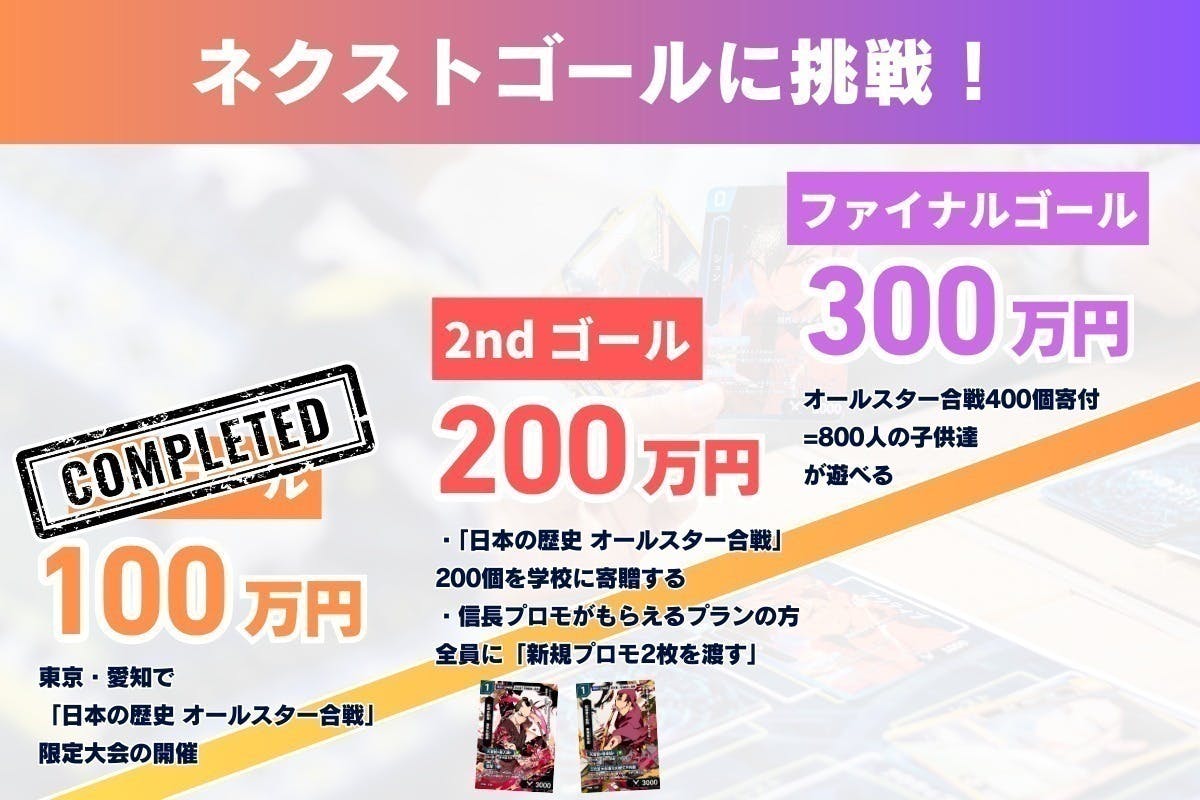 2026/02/05 22:58【1stゴール達成のご報告と御礼】本日18時にスタートしたクラウドファンディングですが、開始からわずか90分で、1stゴールの100万円を達成することができました。本当に、本当にありがとうございます。たくさんのご支援、応援のコメント、一つひとつが大きな力になっています。今回のクラウドファンディングでは、2ndゴールを達成した際に、東京・愛知周辺の地域の学校に200個以上寄贈することを目標を掲げています。さらに、上記2ndゴール達成の際に、「クラファン限定の織田信長プロモーションカードをもらえるプラン」の方全員に、「東洲斎写楽&喜多川歌麿のプロモーションカード」をプレゼントしたいと考えています!!既に応援していただいている皆様にも、「周りの方への周知」のご協力をしていただければ嬉しいです!そして、ここからが本当のスタートです。次は2ndゴール達成に向けて、全力で走っていきます。ご支援いただいた皆さま、改めて本当にありがとうございます。引き続き、応援・そして周りの方へのシェアもしていただけると、とても嬉しいです。どうぞ最後まで、よろしくお願いいたします。 もっと見る