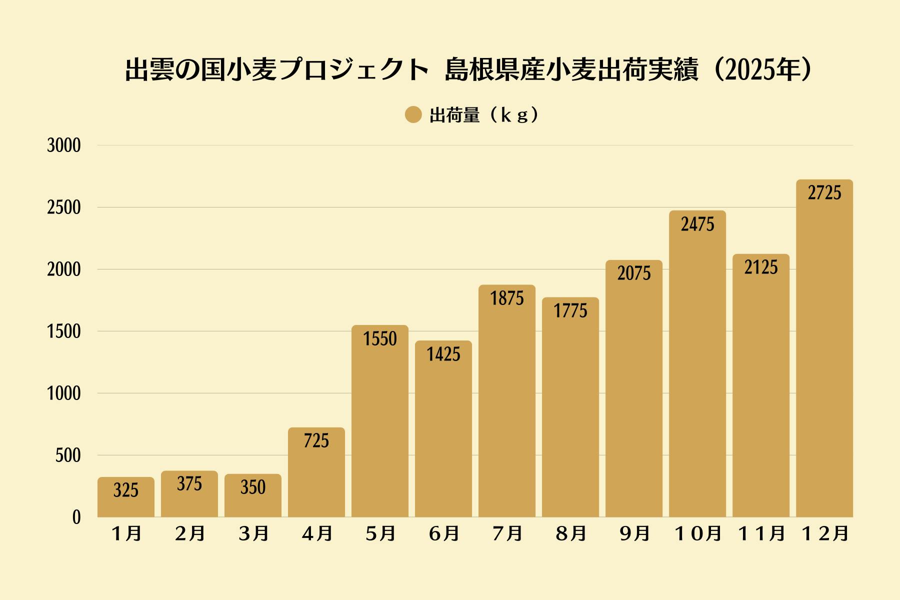 2026年1月現在、30を超える事業所・店舗で島根県産小麦を使用した商品を製造・販売いただいています。また出荷実績は17,000kgを超え、出荷量は増加傾向にあります。