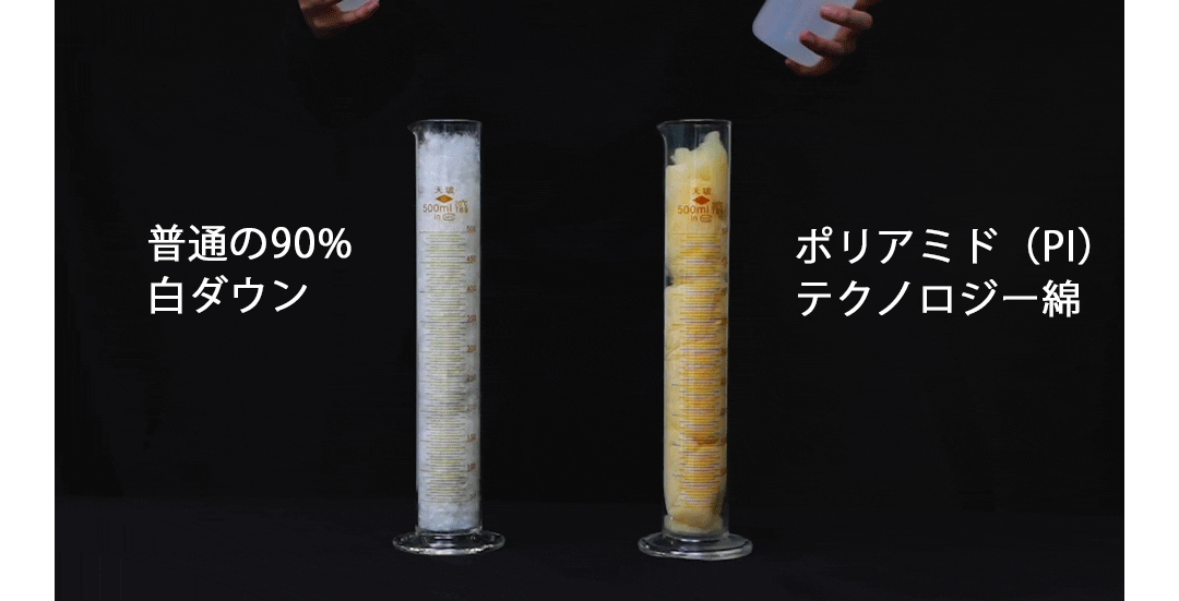 PI綿は従来の90%ダウンと比べて保温性能が37%向上。CLO値2.75、保温率82%を実現し、寒冷地でも快適な暖かさを提供します。