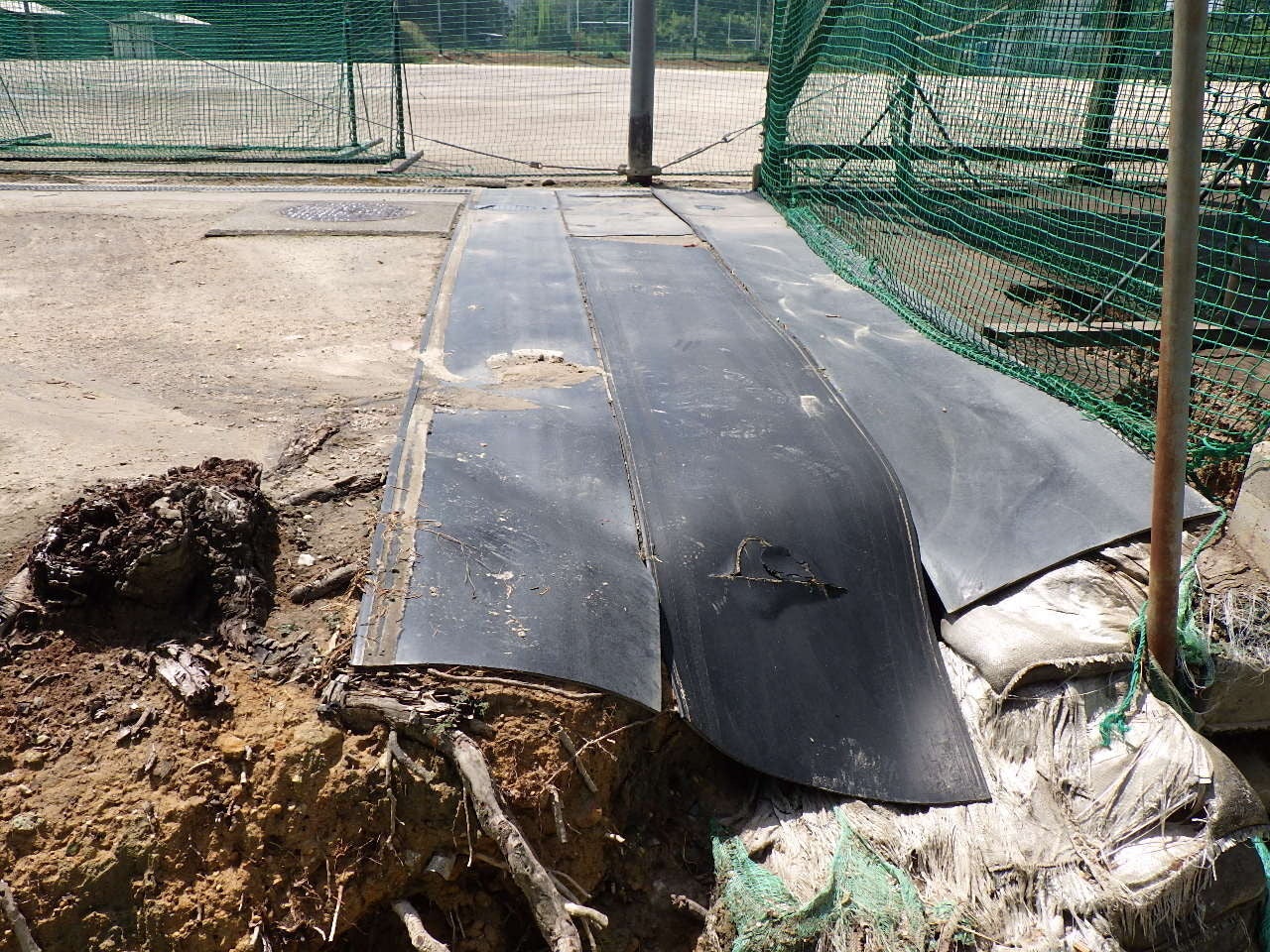 豪雨の影響で、一塁側ブルペン横の法面が大きく崩れ落ちました。
