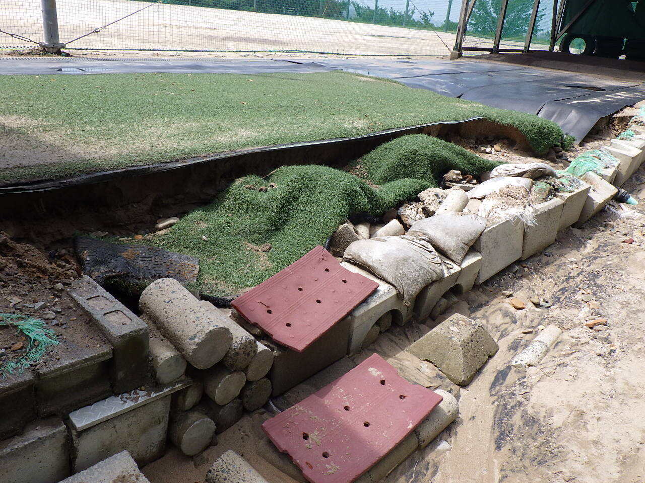 豪雨の影響で、一塁側ブルペン横の法面が大きく崩れ落ちました。