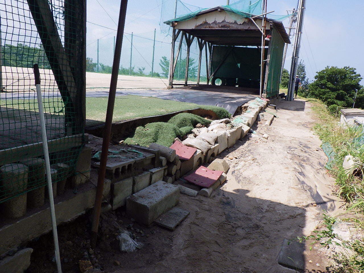 豪雨の影響で、一塁側ブルペン横の法面が大きく崩れ落ちました。