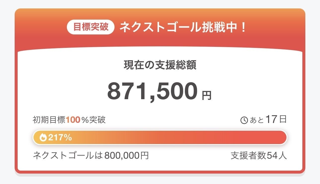 みなさまのおかげで、ネクストゴール200%の80万円を達成しました!!