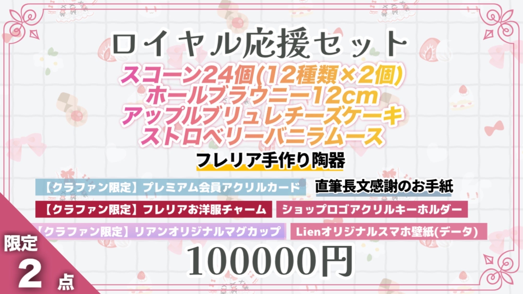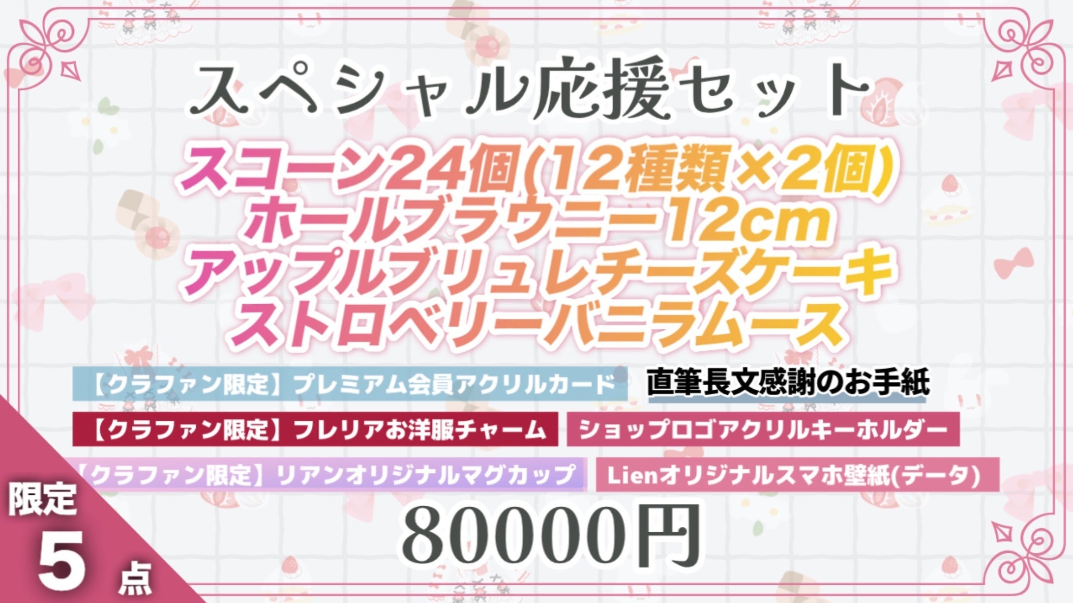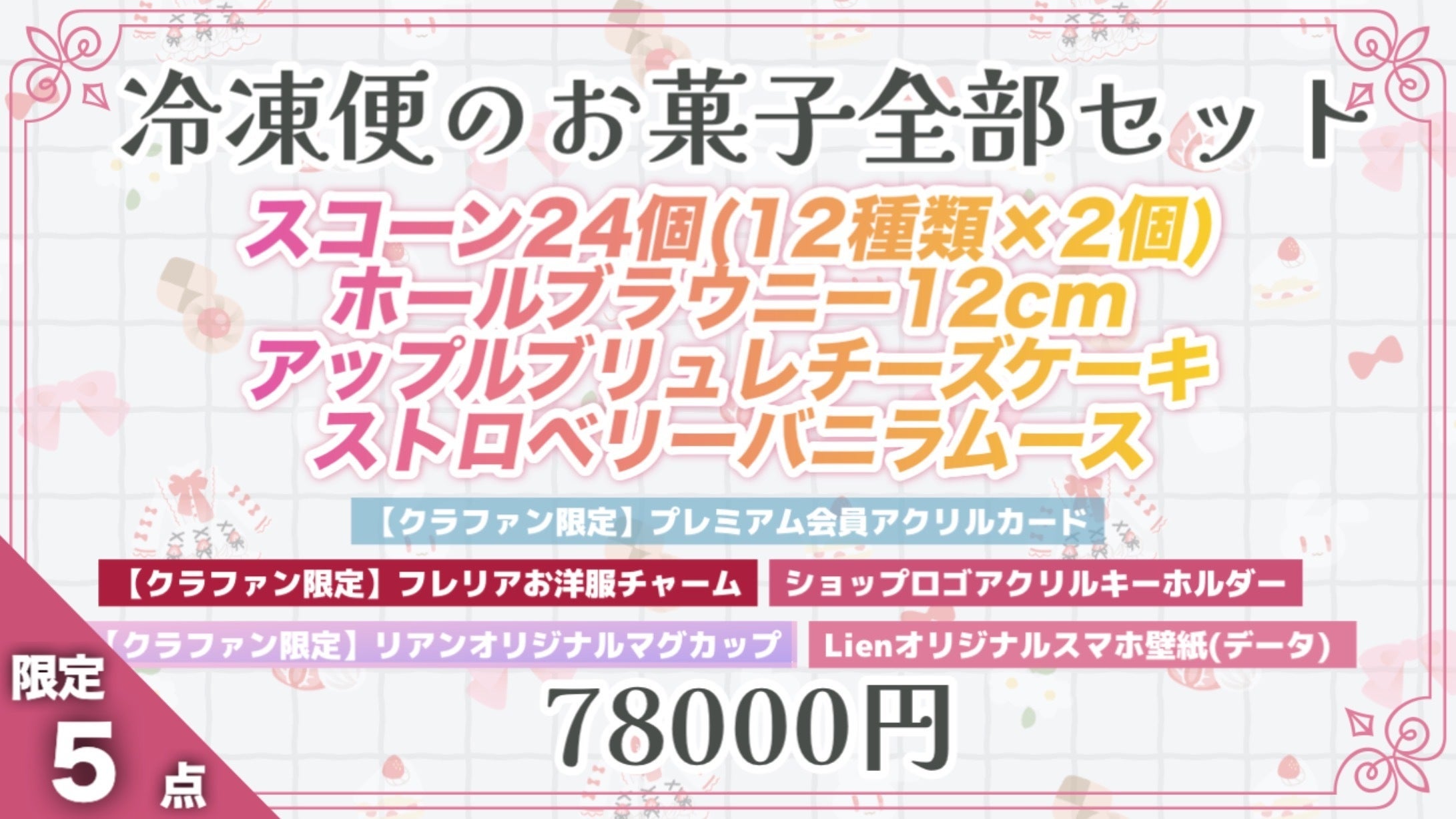 CF限定スイーツ(ホールブラウニー・お試し便・アップルブリュレチーズタルト・ストロベリーバニラムース・スコーン24個セット)については、現時点では同セットで販売する予定はございませんが、将来的に販売する可能性があります。