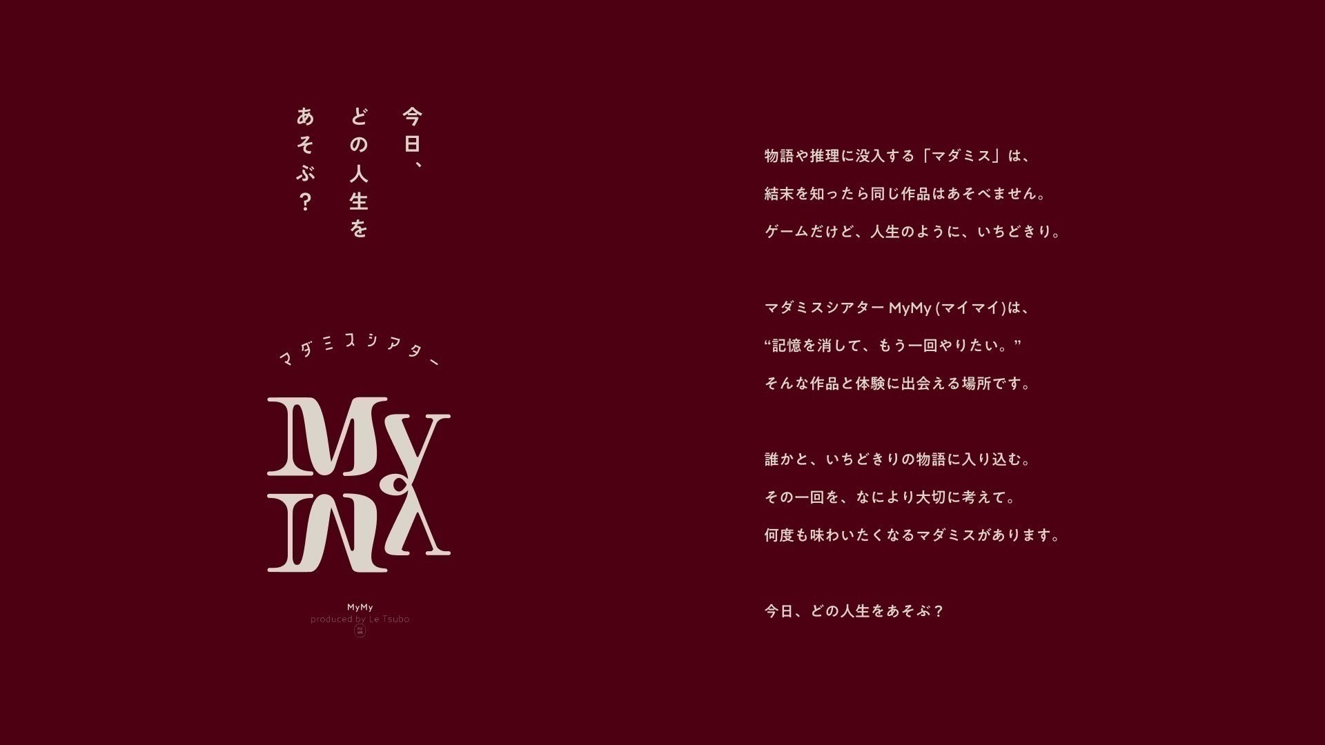 キュレーションした作品、 洗練された空間演出、 ゲストの物語体験を支えるGM(ゲームマスター)、さまざまな要素を掛け合わせ、「体験としてのマダミス」を追求して生まれたのが、 マダミスシアター MyMyです。