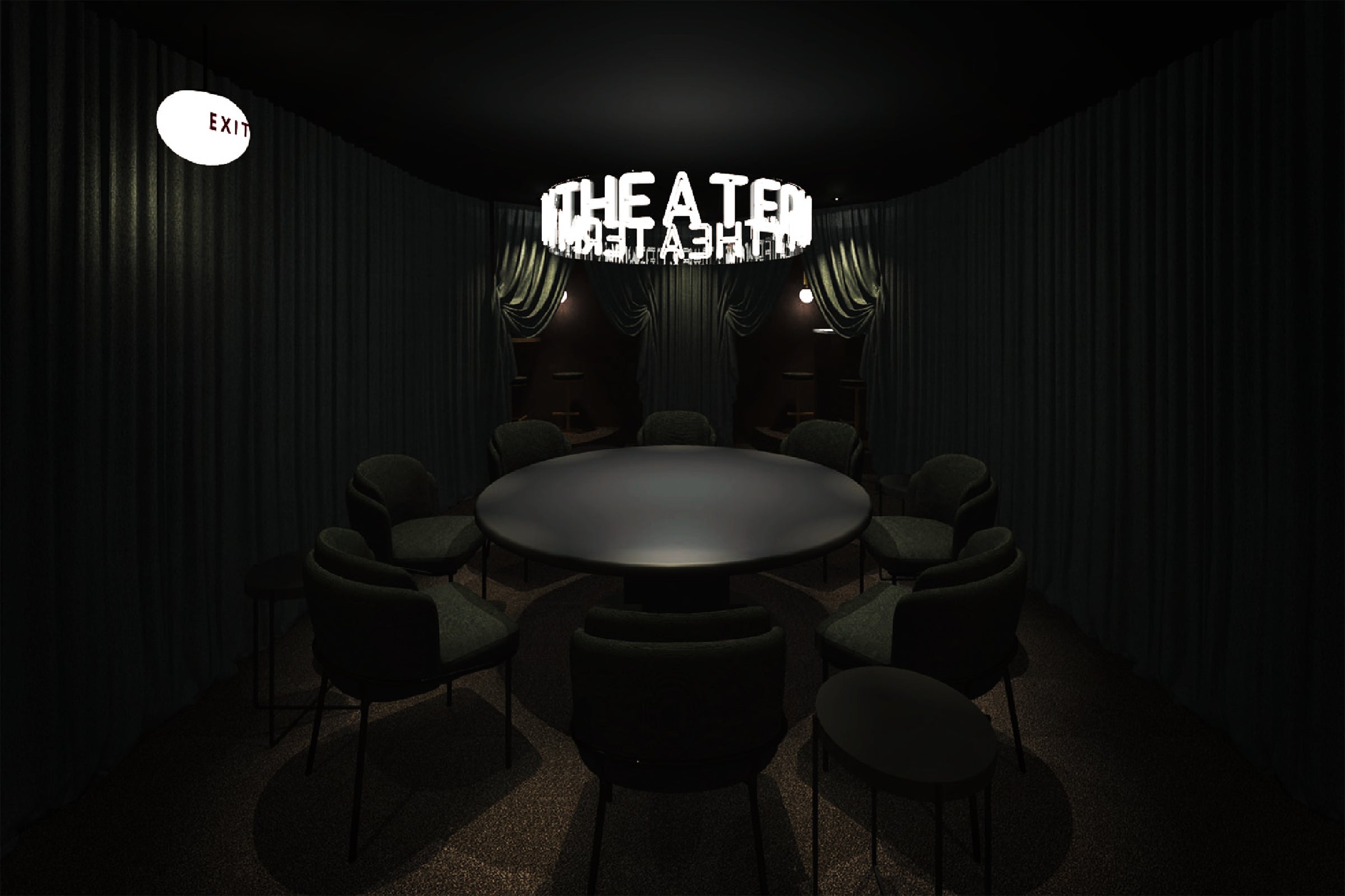 ゲームを楽しむシアタールームは、緞帳(どんちょう)を思わせるカーテンが360°を囲み、空間そのものが舞台装置になる“円形劇場”です。
