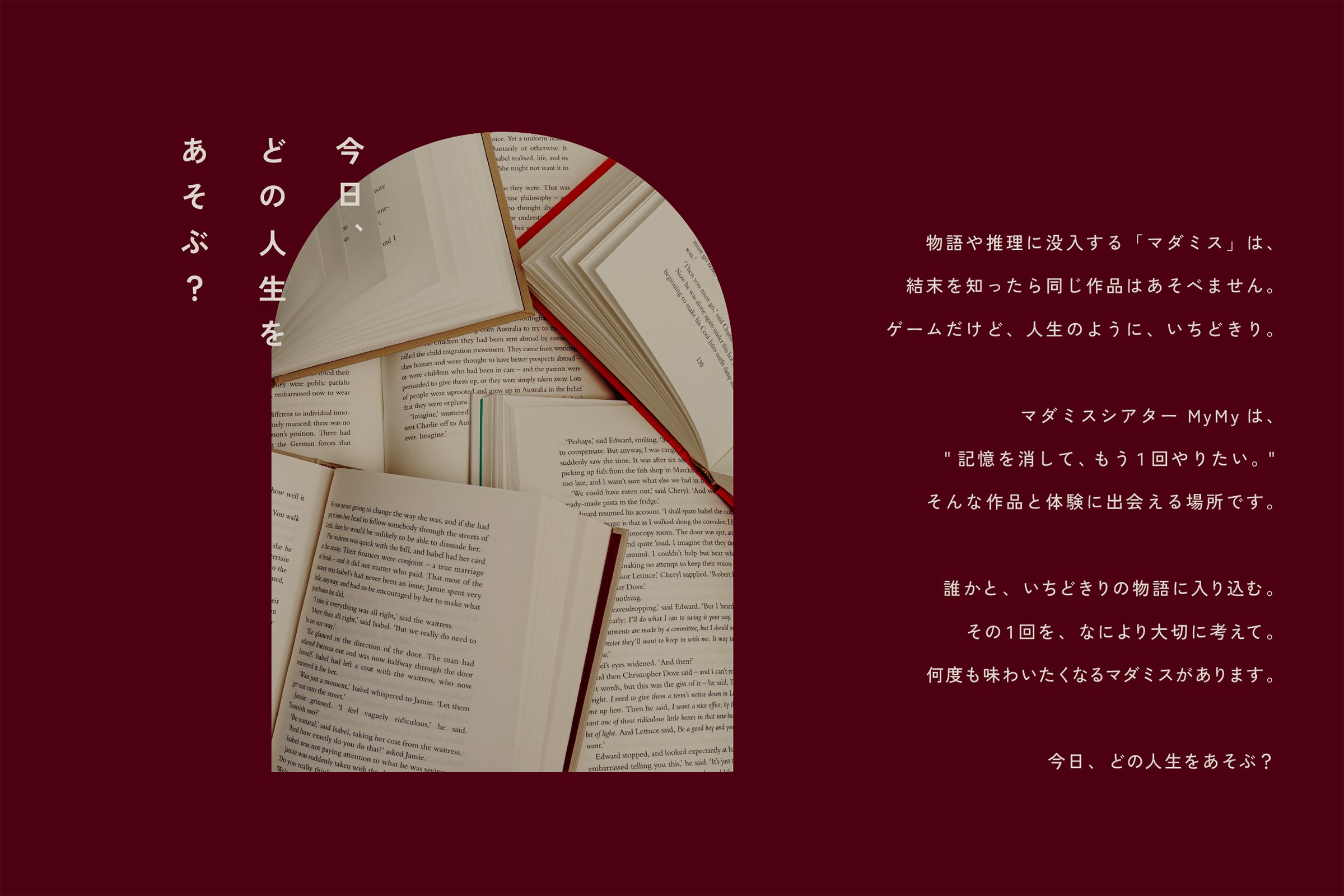 キュレーションした作品、 洗練された空間演出、 ゲストの物語体験を支えるGM(ゲームマスター)、さまざまな要素を掛け合わせ、「体験としてのマダミス」を追求して生まれたのが、 マダミスシアター MyMyです。