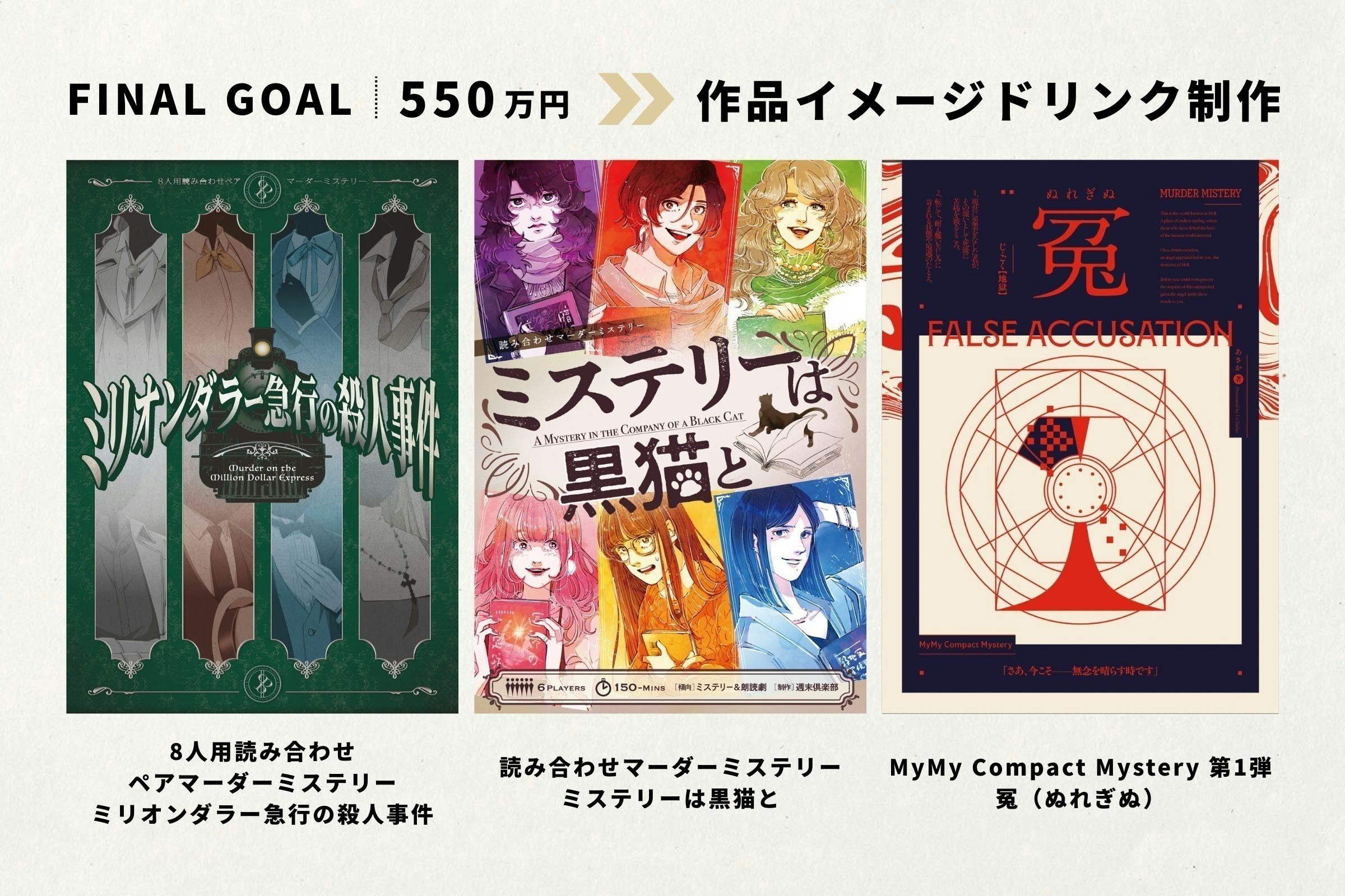 2026/02/24 08:56みなさまからの応援により、現在、目標の100万円を大きく超えるご支援金額をいただいております。本当にありがとうございます!ご期待に応えられるよう、“物語に没入する劇場体験”への挑戦を続けていきます。そして今回、クラウドファンディング期間の終了間近ではございますが、物語の世界観をより深く味わっていただくために、下記のファイナルゴールを設定しました。◼︎ FINAL GOAL:550万円上記目標達成時、下記3作品それぞれの世界観を表現したオリジナル・イメージドリンクを制作します。・8人用読み合わせペアマーダーミステリー ミリオンダラー急行の殺人事件・読み合わせマーダーミステリー ミステリーは黒猫と・MyMy Compact Mystery第1弾:冤(ぬれぎぬ)物語体験の余韻が残るシアターで、心が動いた瞬間を思い返しながら、五感で楽しめるようなドリンクを提供できればと考えています。クラファン限定のお得なドリンクチケットのリターンも追加しましたので、ぜひご活用ください! もっと見る