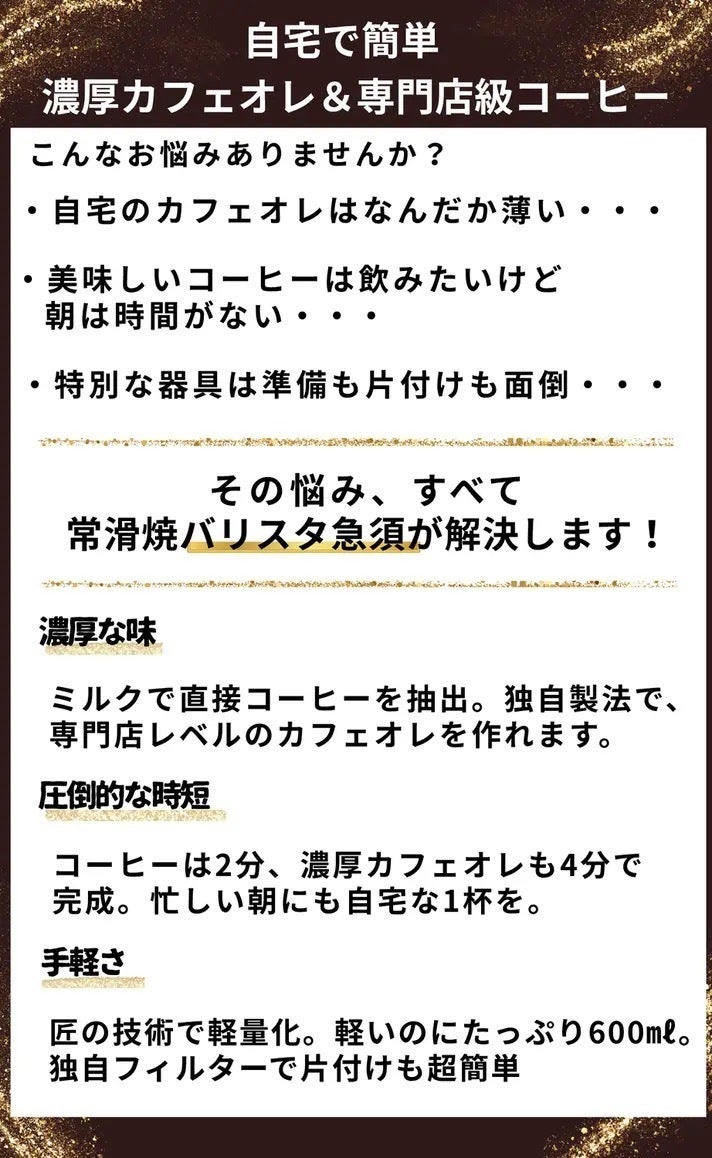 2026/04/11 20:29 皆さま、こんにちは。 数年前、ある地方の温泉街の喫茶店で「ミルクブリュー」という淹れ方に出会いました。水の代わりに牛乳でじっくりコーヒーを抽出する方法で、一口飲んだ瞬間、今まで飲んできたカフェオレとの違いに衝撃を受けました。濃厚で、 なめらかで、それでいて驚くほど甘い。 この味を家でも再現したくて、フレンチプレスで代用してみたり、温度や時間を変えてみたり、試行錯誤を繰り返しました。けれど、どうしても淹れるのに時間がかかる。自宅では難しいと悪戦苦闘でした。 そこで、フレンチプレスと同じ淹れ方で更に雑味やエグ味を取り除けないかとバリスタの方と一緒にゼロから専用の急須を考え、常滑焼の職人さんの手で形にしていただいたのが、この「カフェオレバリスタ急須」です。暑い夏のアイスカフェオレにもぴったりです。 どうぞ最後まで、応援のほどよろしくお願いいたします。 もっと見る