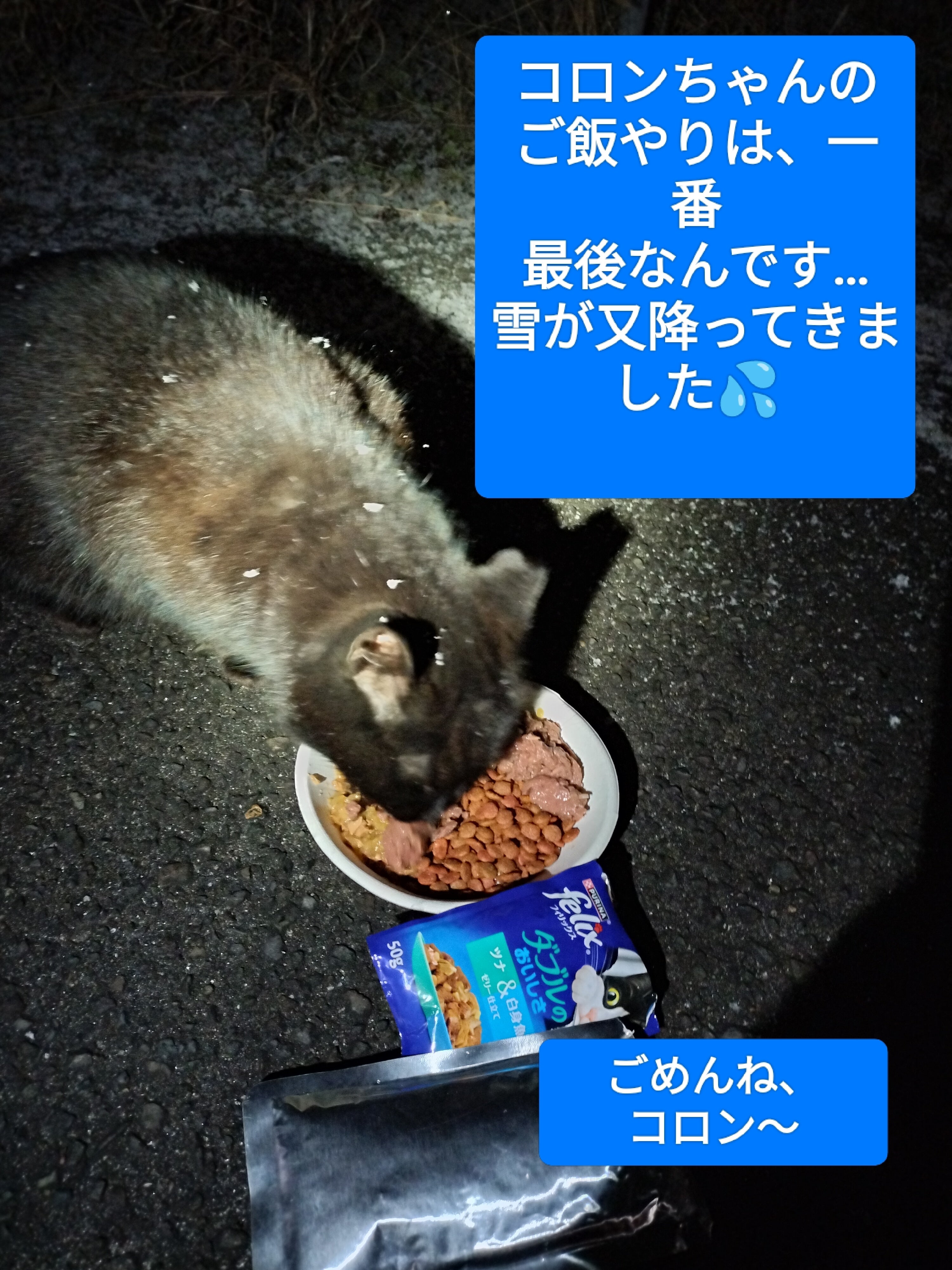 沢山の野良猫達が毎晩ご飯を楽しみにしています。寒い中で、いつまでもご飯を待っています。 どうそ、皆様の温かいご支援をよろしくお願い致します。