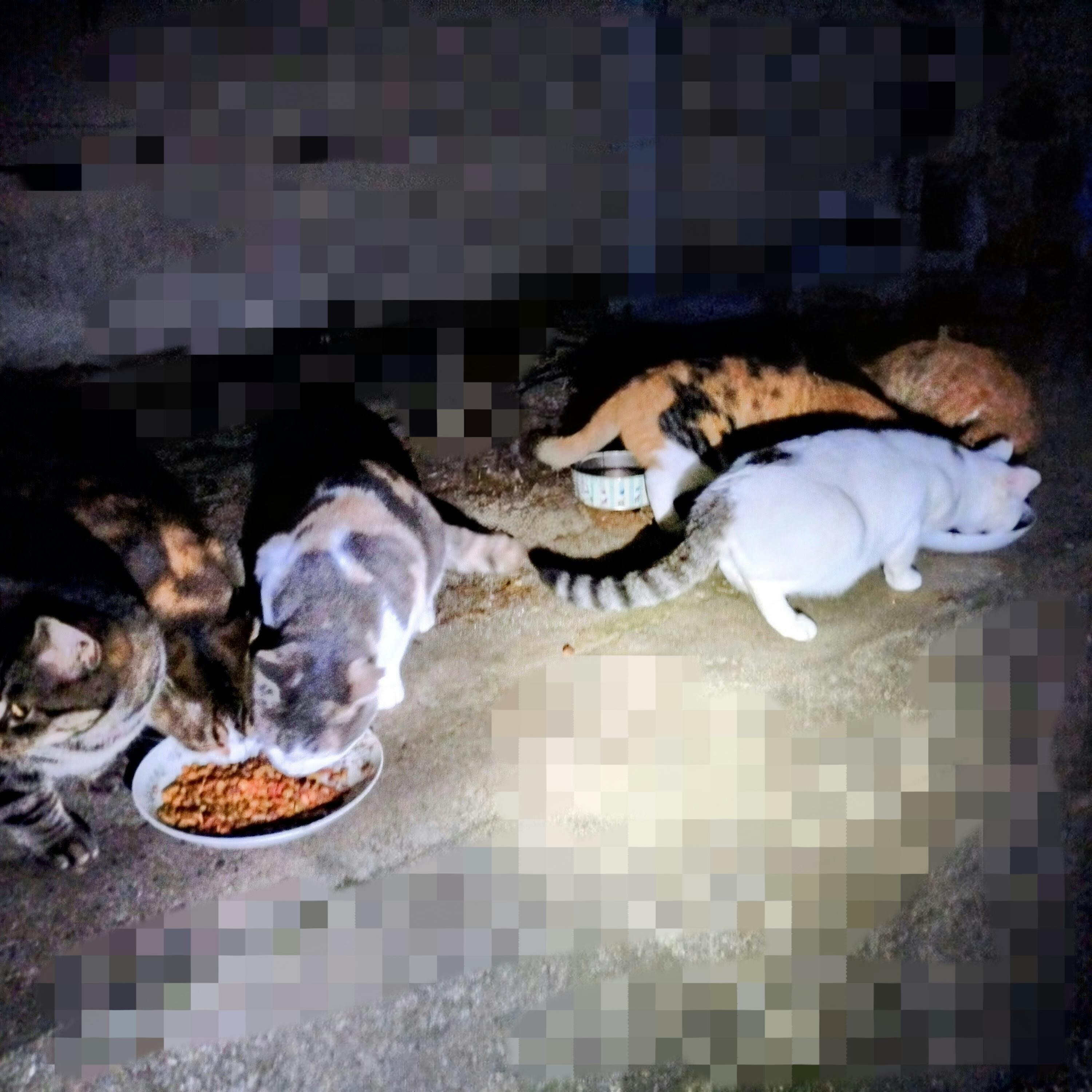 私は毎晩30匹位の野良猫達のえさやりを仕事帰りに回っています。日によって出てこないこたちもいます。 大体みんなご飯を待ちわびています… 全員が私を呼ぶのです… はい、はい、ごはんですよ〜