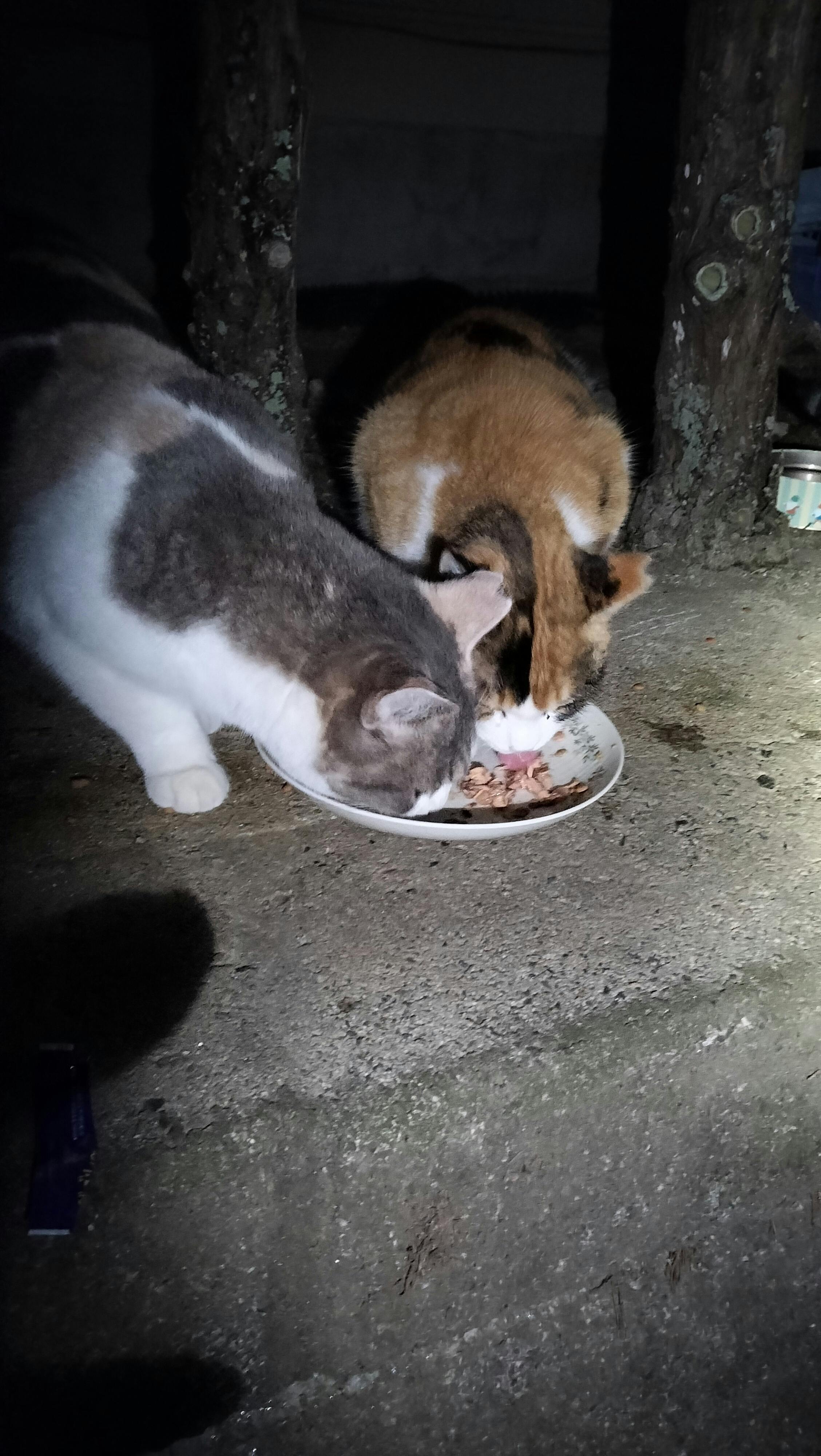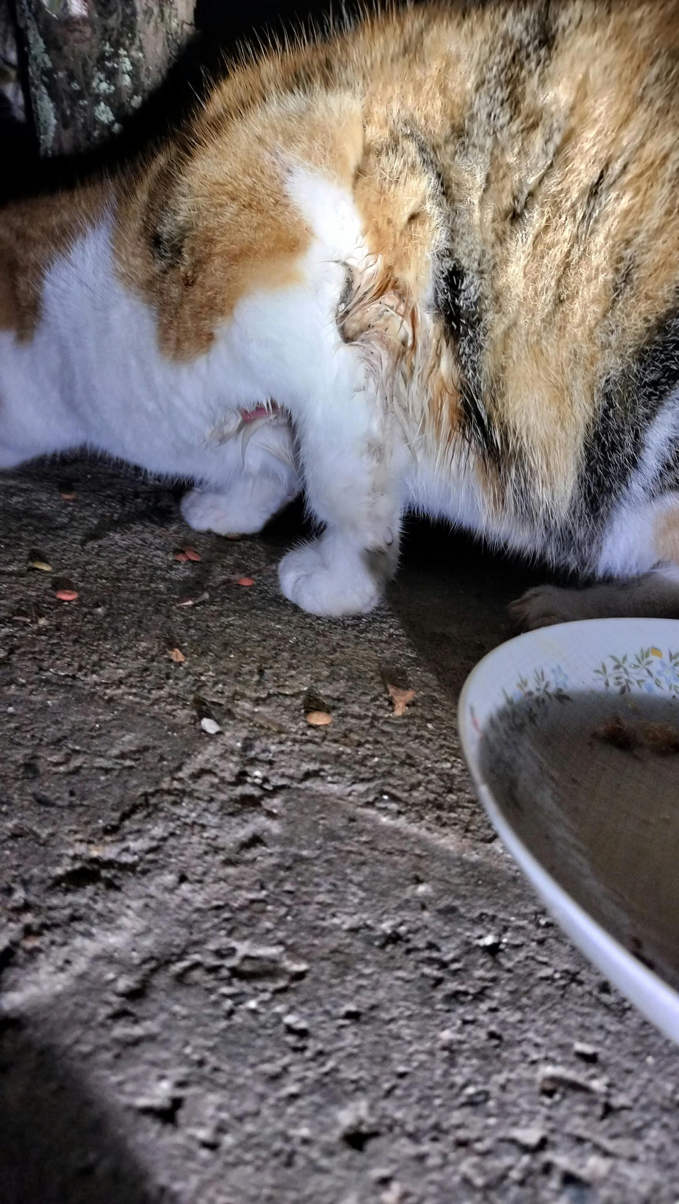 今朝餌やりに行きましたら、ミケちゃんが出て来ました〜 苦しんで、亡くなっているかと心配でしたが、なんと、軽々に壁を登って来ました。昨日のお薬が効いてくれました〜 ご飯も凄く勢いよく食べていました。病院からの3種類の薬を混ぜたら、味がまずいのか、なかなか全部食べてくれませんでした、チュールを混ぜてどうにか食べさせました。 その間、別の猫達がミケちゃんのご飯を食べようとするのです。止めるのに大変でした…
