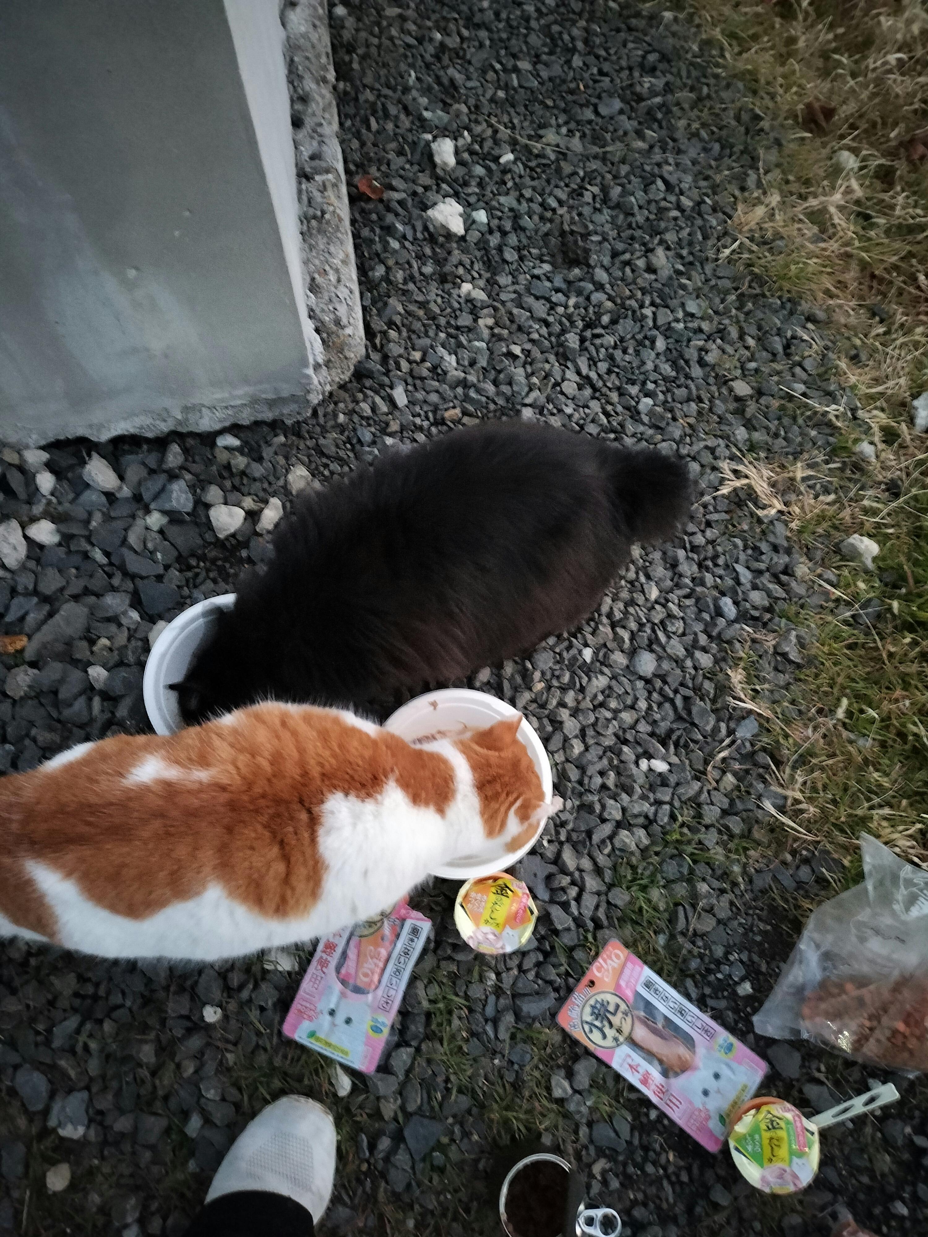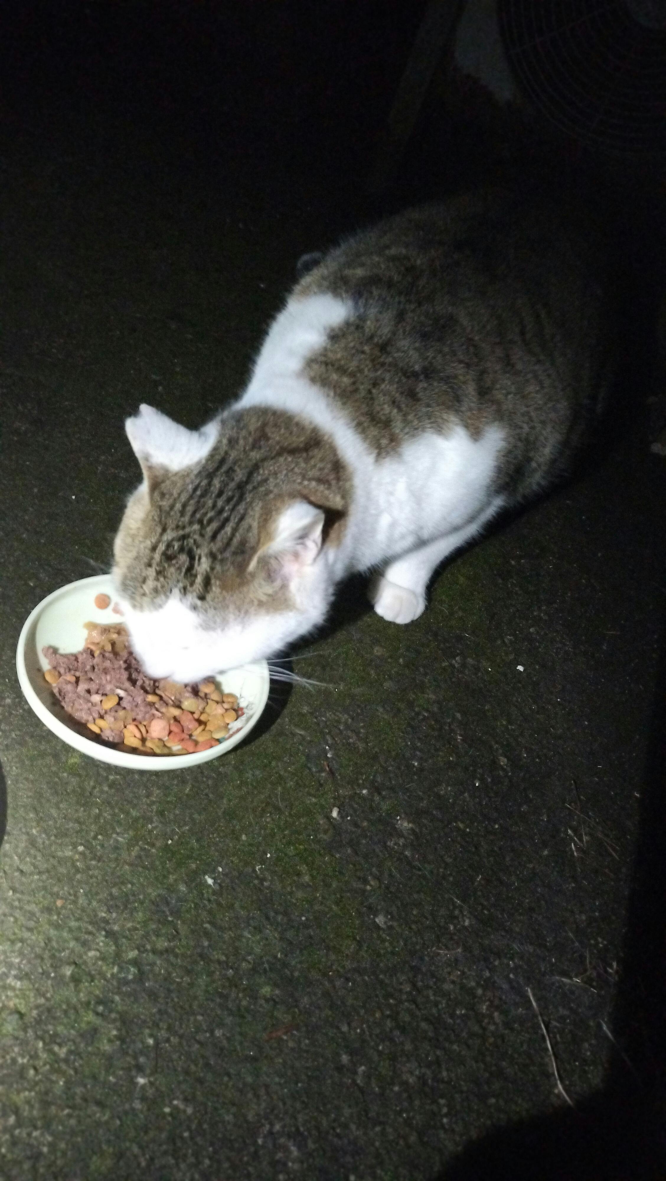 支援者様からの美味しいご褒美を夢中で食べています。 太陽も出てきました。 明るい時間帯に餌やりするのは久々でした。 すべての景色も明るくなり、夜中よりも周りがよく見えます。当たり前ですが、居なくなったタマくんも出てくるのではないかと期待をしてしまいました。